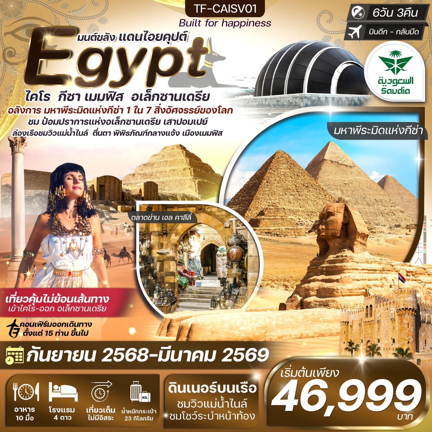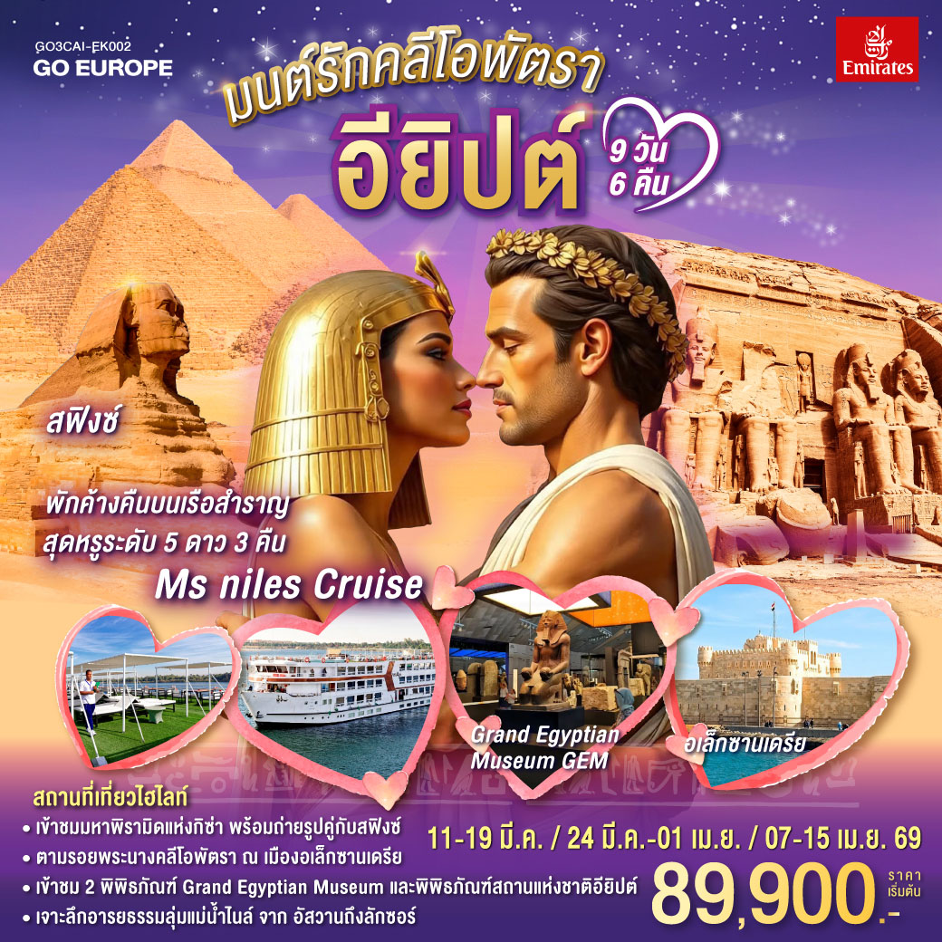 ทัวร์อียิปต์ ปีใหม่ 2569 ไคโร อเล็กซานเดรีย มหาพีรมิดกีซ่า พิพิธภัณฑ์กลางแจ้ง ล่องเรือชมวิวแม่น้ำไนล์ 6 วัน 3 คืน (พักโรงแรม 4 ดาว) เที่ยวเต็ม ไม่มีอิสระ