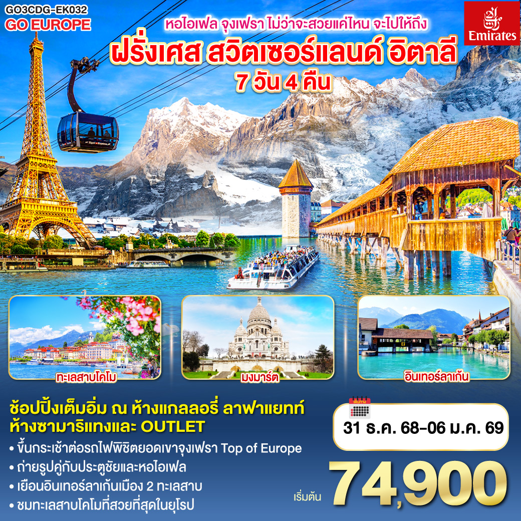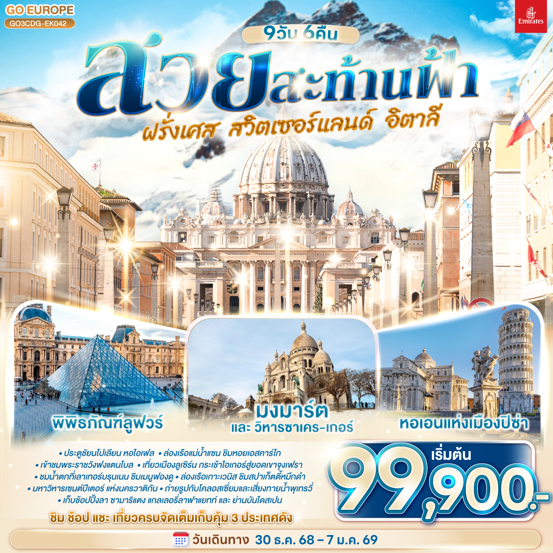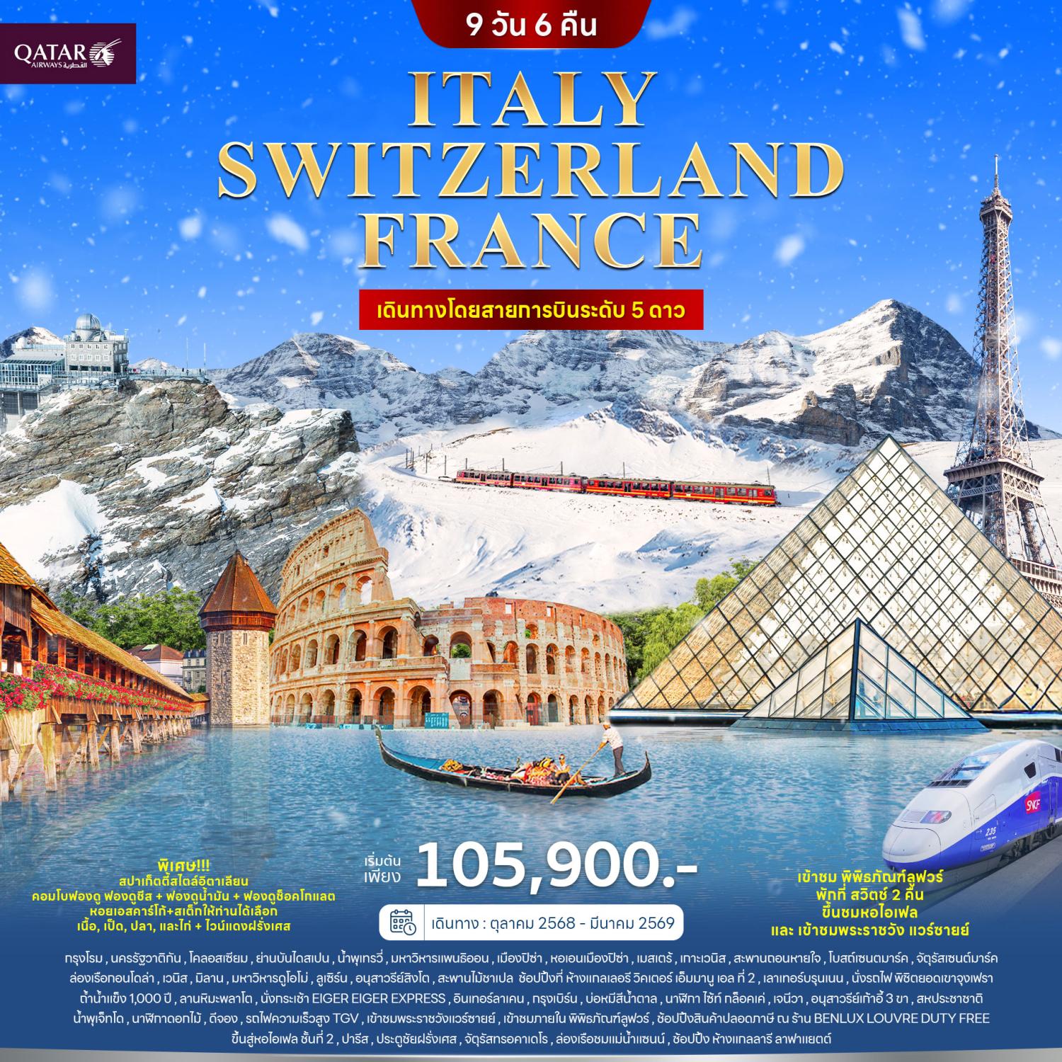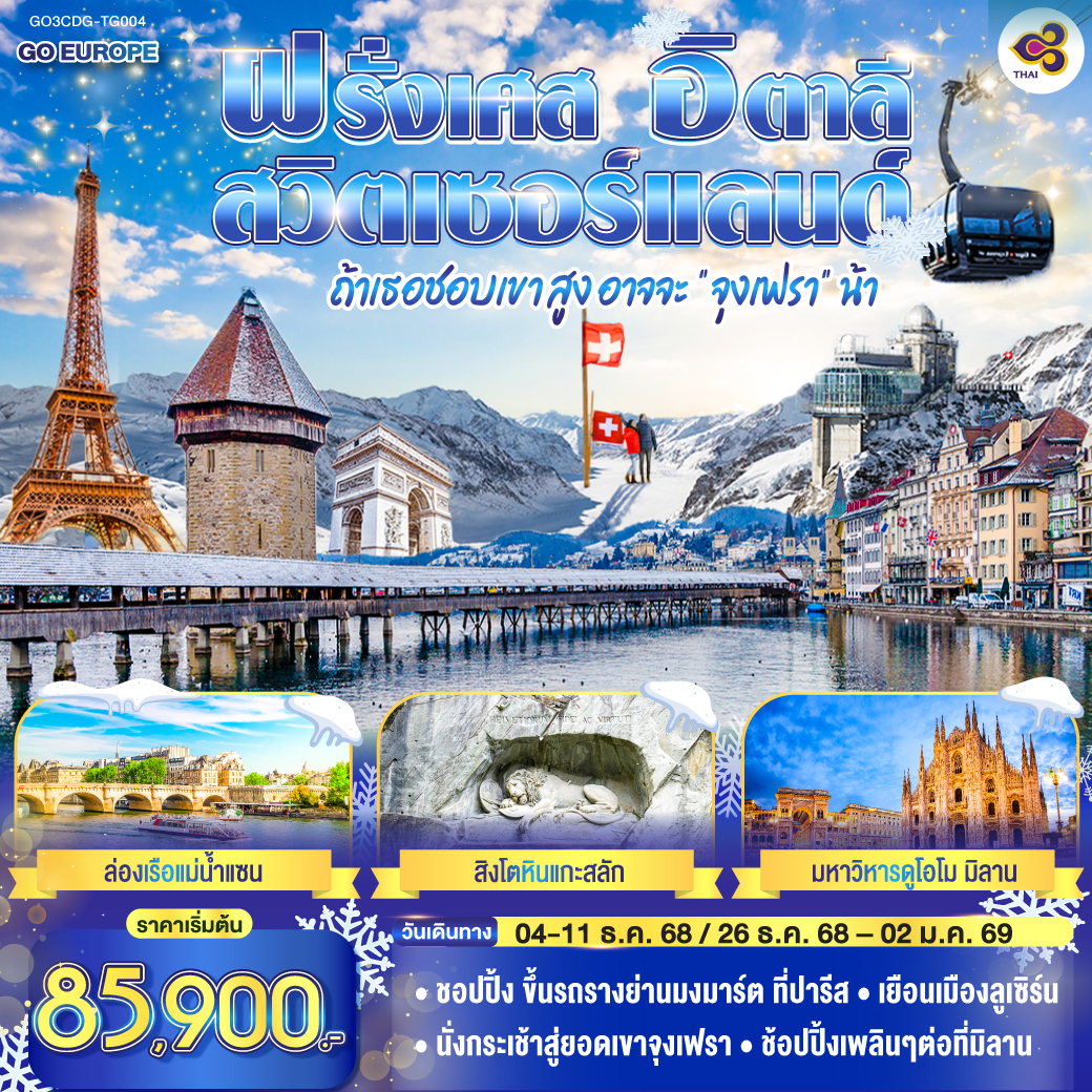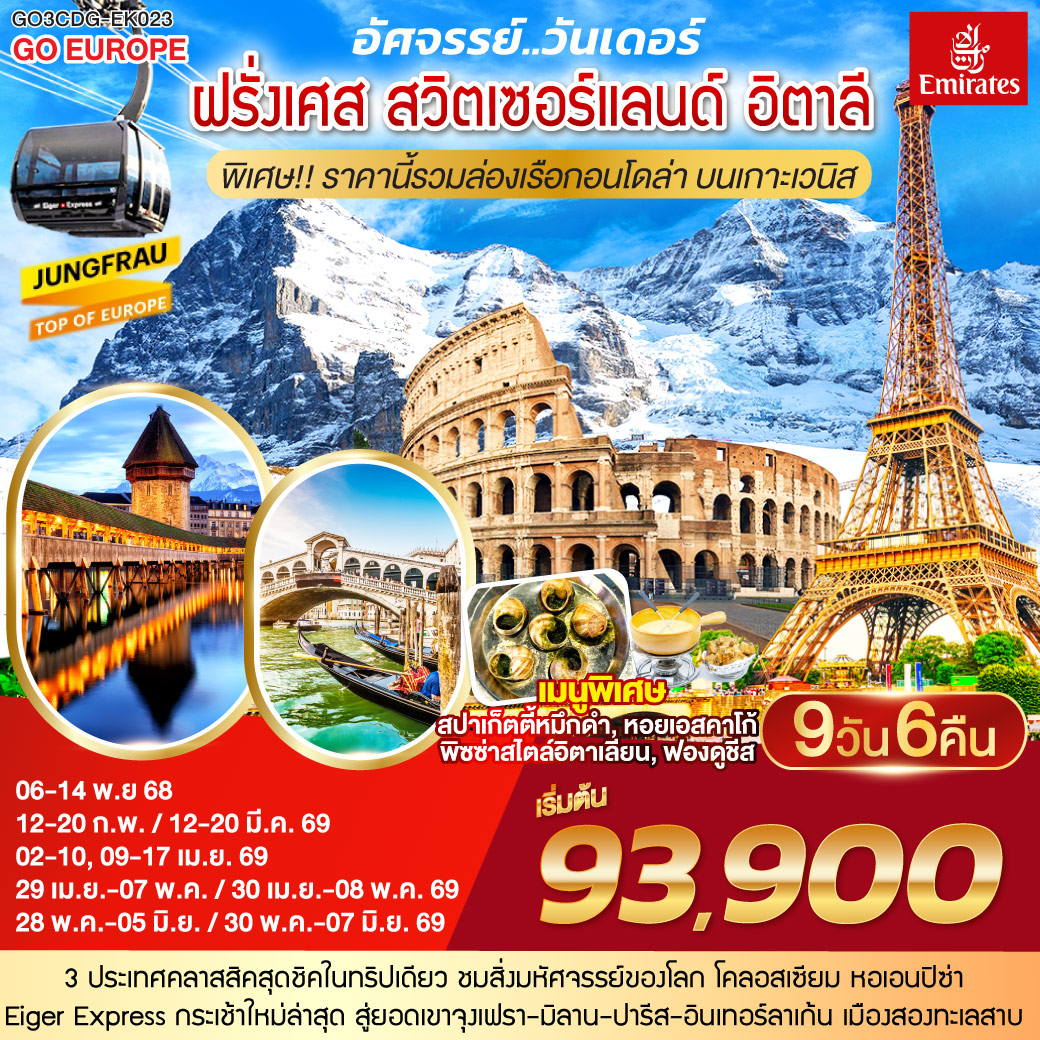 ทัวร์ฝรั่งเศส สวิตเซอร์แลนด์ อิตาลี ปีใหม่ 2026 ล่องเรือแม่น้ำแซน กระเช้าไอเกอร์เอ๊กซ์เพรส ยอดเขาจุงเฟรา 9 วัน 6 คืน รวมล่องเรือกอนโดล่า บนเกาะเวนิส