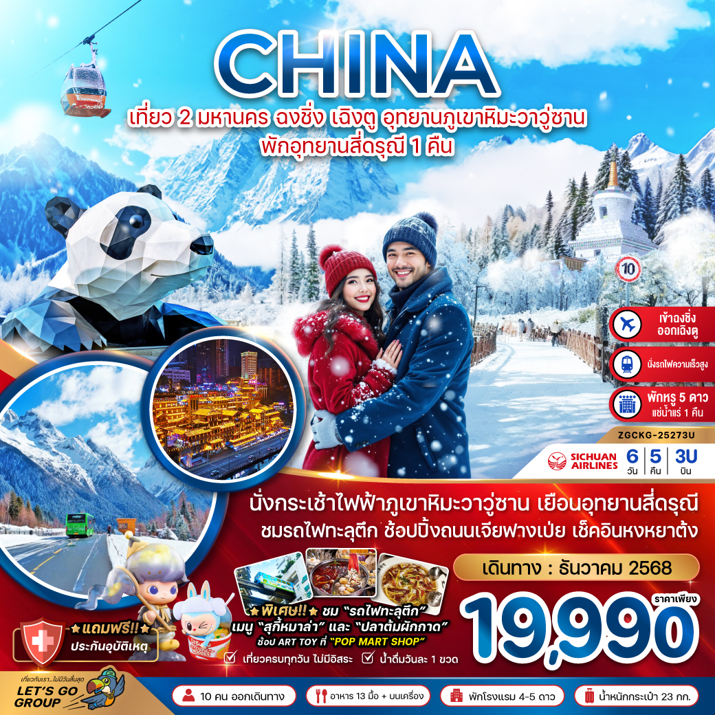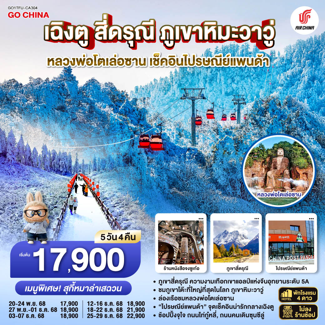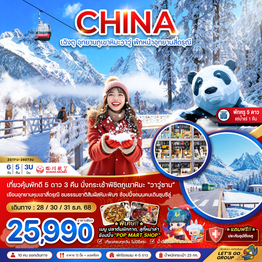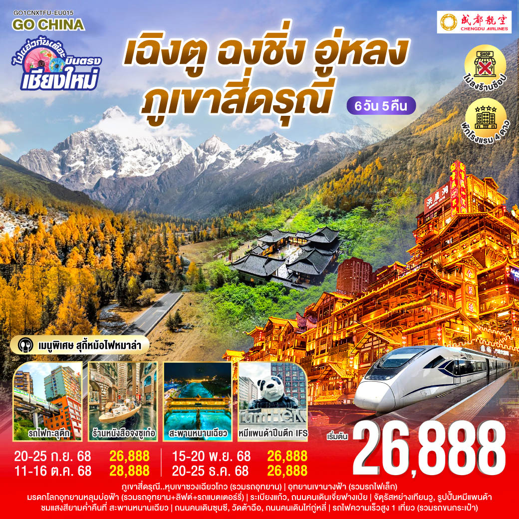 ทัวร์เฉิงตู อุทยานภูผาหิมะสวรรค์ ต๋ากู่ปิงชวน เหลียนเปาเย่เจ๋อ แพนด้ายักษ์ปีนตึก 5 วัน 4 คืน (ทัวร์ไม่ลงร้านช้อป)