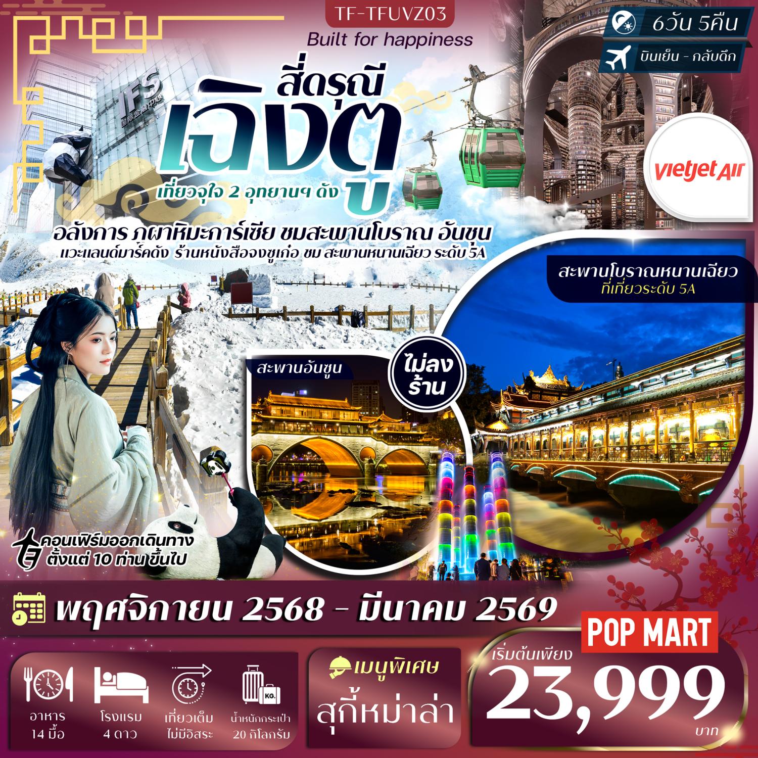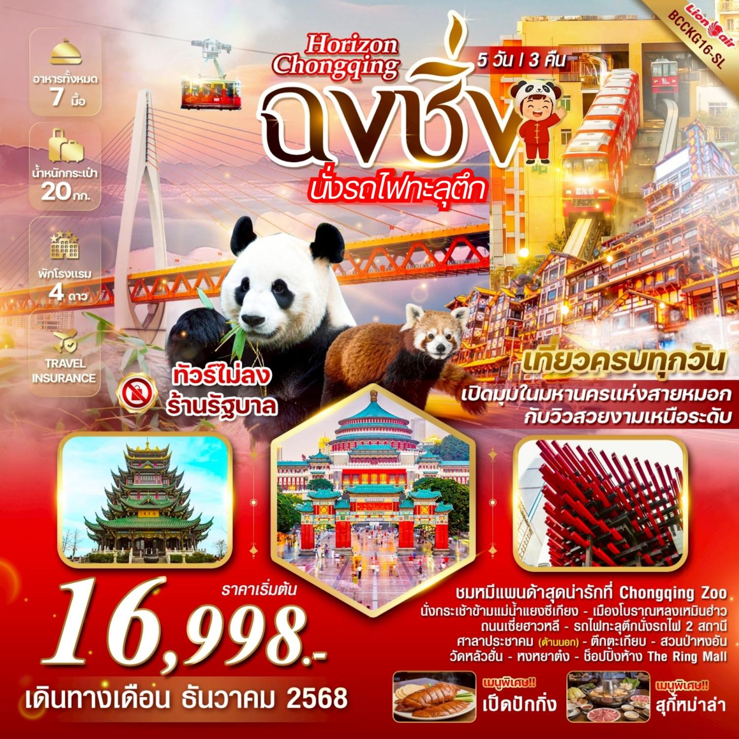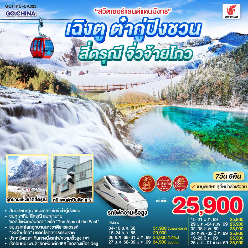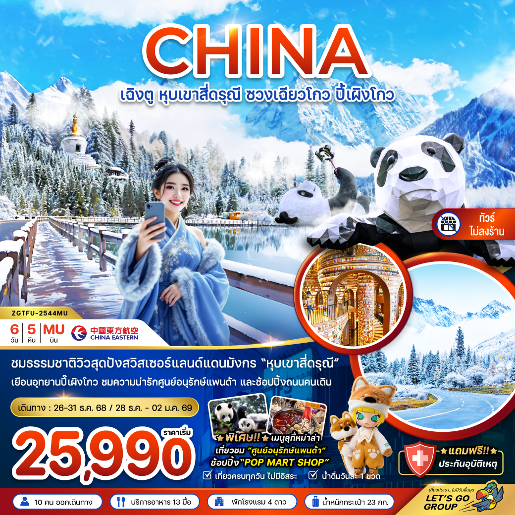 ทัวร์เฉิงตู อุทยานภูผาหิมะสวรรค์ ต๋ากู่ปิงชวน เหลียนเปาเย่เจ๋อ แพนด้ายักษ์ปีนตึก 5 วัน 4 คืน (ทัวร์ไม่ลงร้านช้อป)
