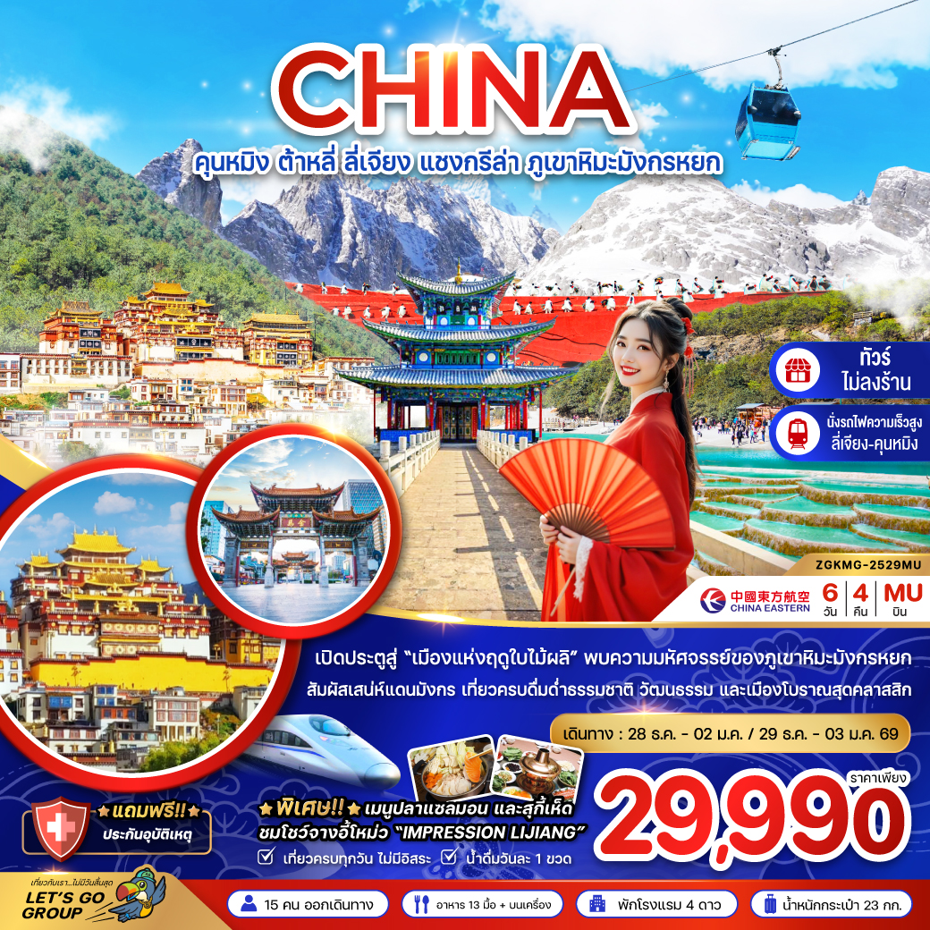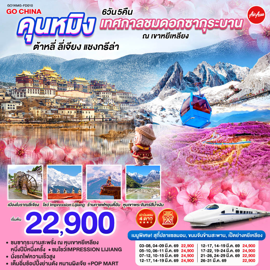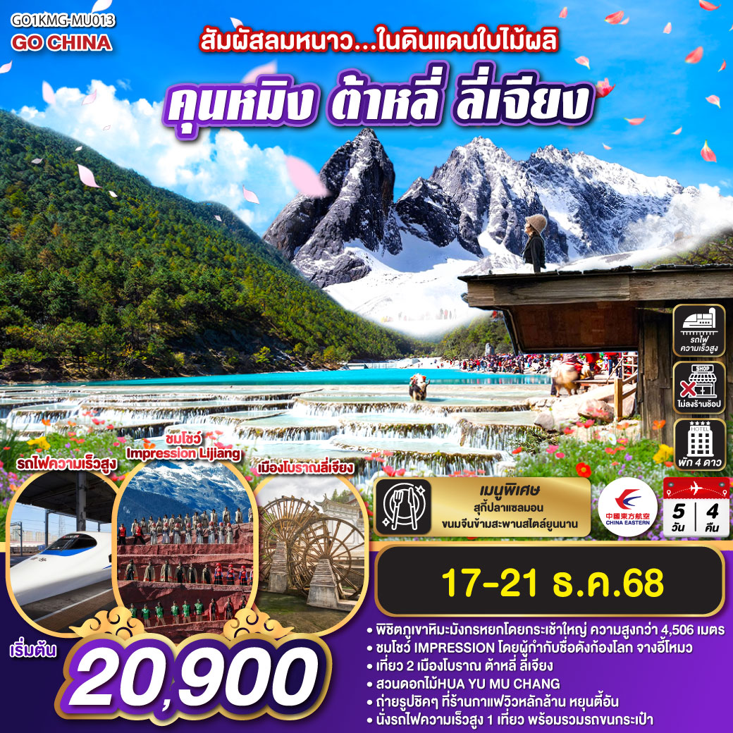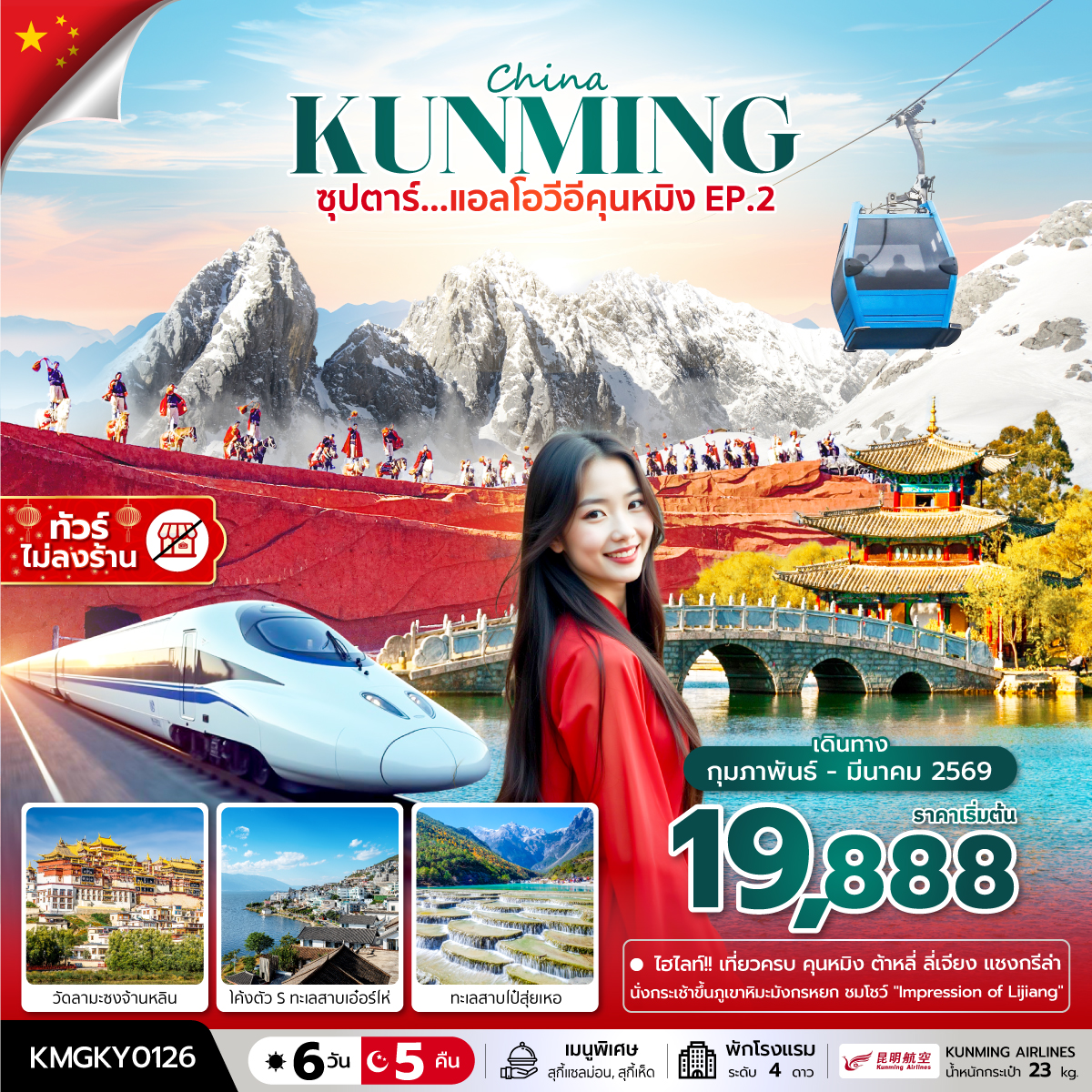 ทัวร์คุนหมิง ต้าหลี่ ลี่เจียง แชงกรีล่า นั่งรถไฟชมวิวหิมะมังกรหยก ช่องแคบเสือกระโดด 6 วัน 5 คืน นั่งรถไฟความเร็วสูง (ทัวร์ไม่ลงร้านช้อป)