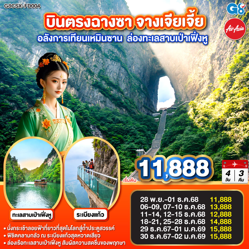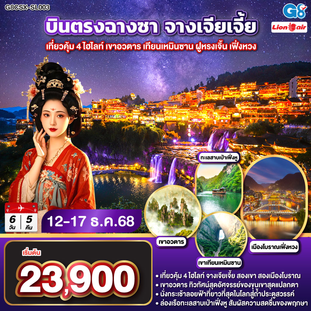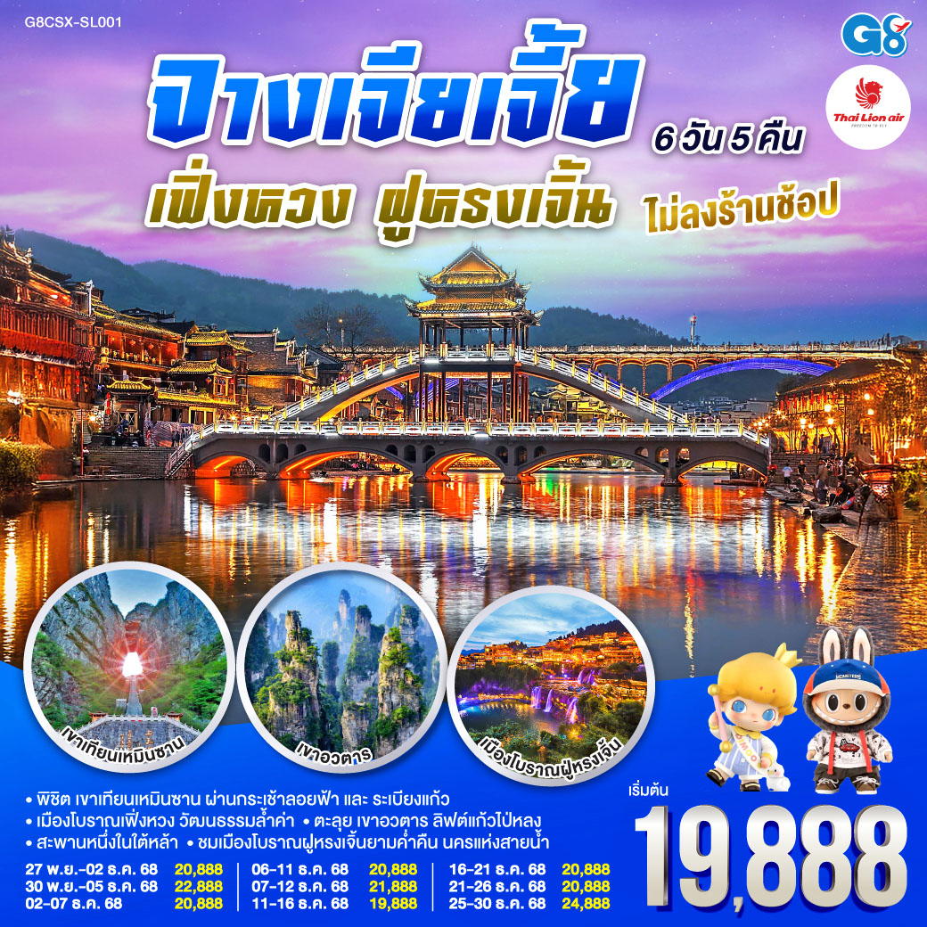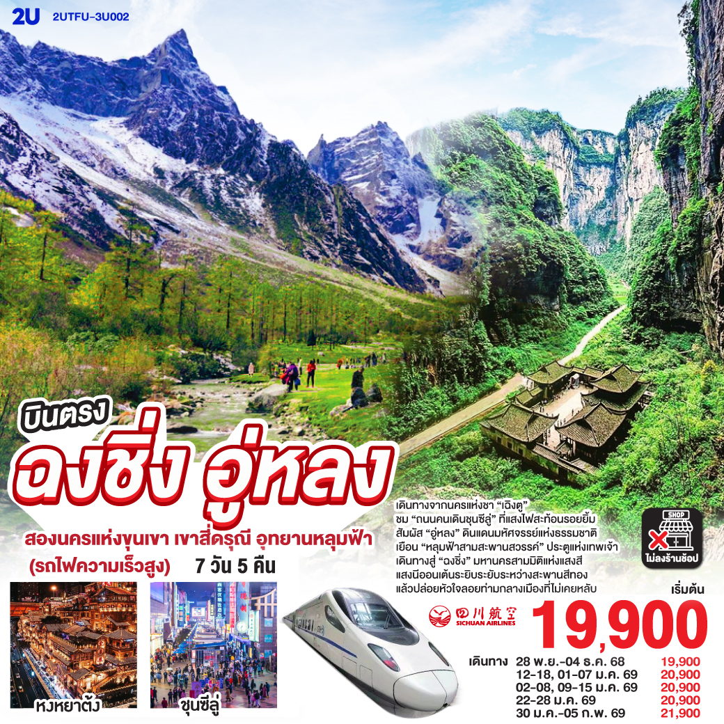 ทัวร์ฉงชิ่ง จางเจียเจี้ย ฤดูหนาว อู่หลง อุทยานเขานางฟ้า ประตูสวรรค์ เทียนเหมินซาน น้ำตกฟูหรงเจิ้น 6 วัน 4 คืน พิเศษ! นั่งรถไฟความเร็วสูง (พักเมืองฟูหรงเจิ้น)