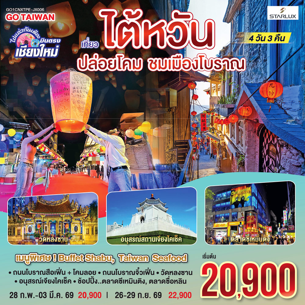ทัวร์ไต้หวัน ปีใหม่ 2569 มหานครแห่งเมืองสีสัน ไทเป ล่องเรือสุริยันจันทรา ปล่อยโคมลอยผิงซี เหย่หลิ่ว 4 วัน 3 คืน