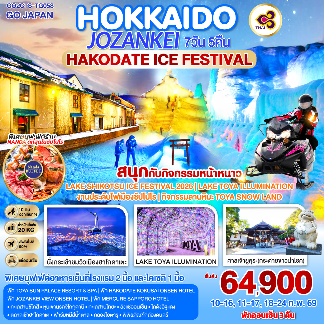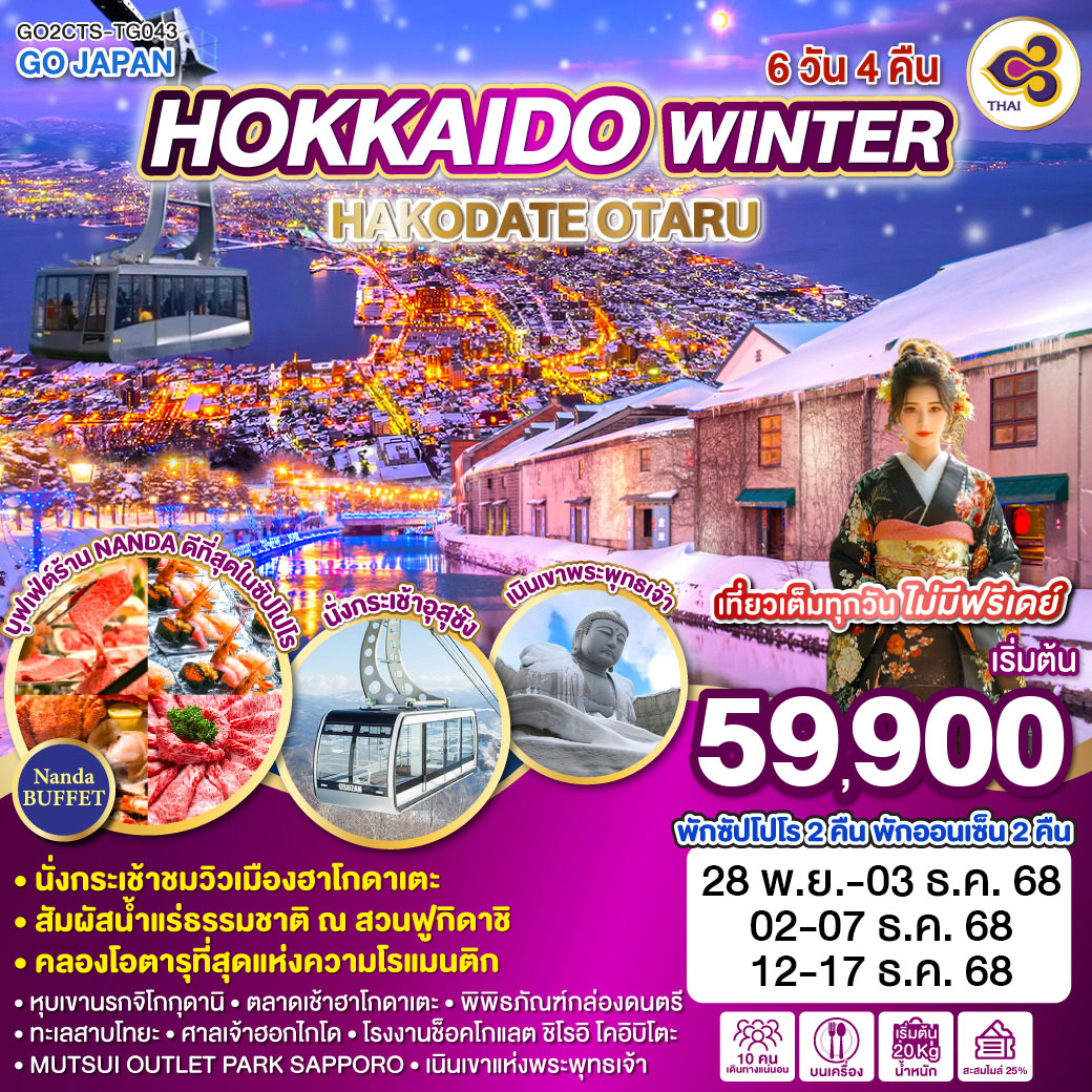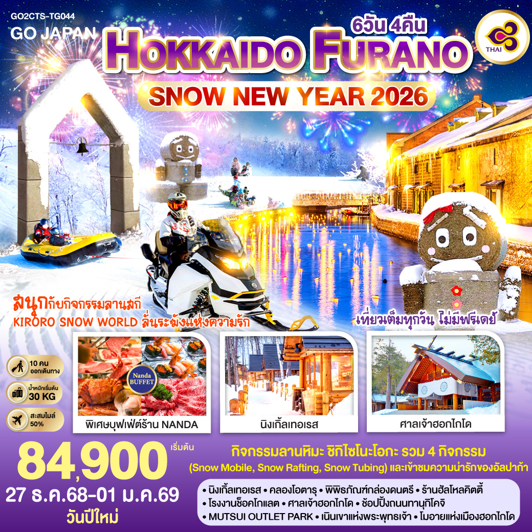 ทัวร์ฮอกไกโด เช็คอินหมู่บ้านนิงเกิ้ลเทอเรส ลานสกีชิคิไซ พาโนราม่า 6 วัน 4 คืน อิสระท่องเที่ยว 1 วัน (บินการบินไทย TG)
