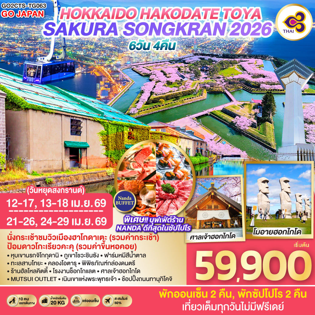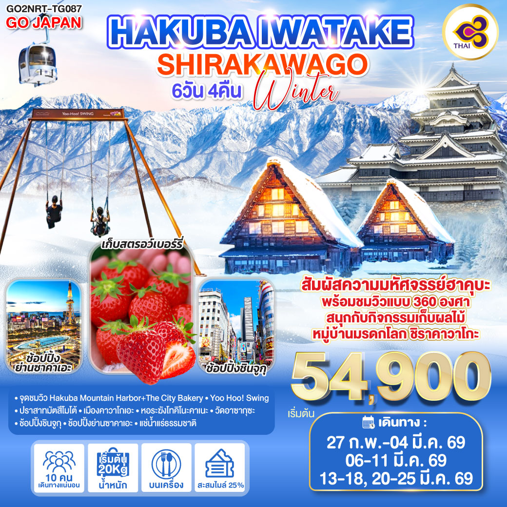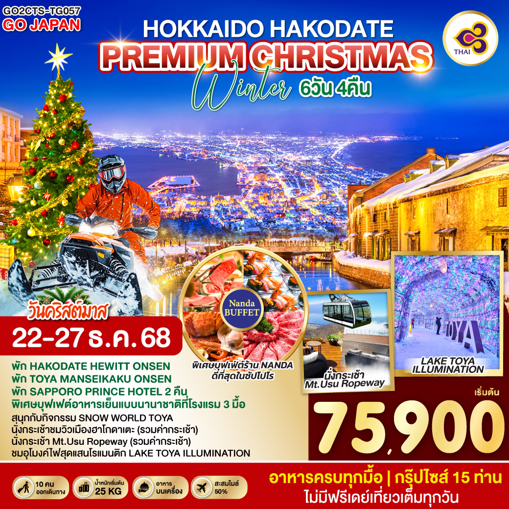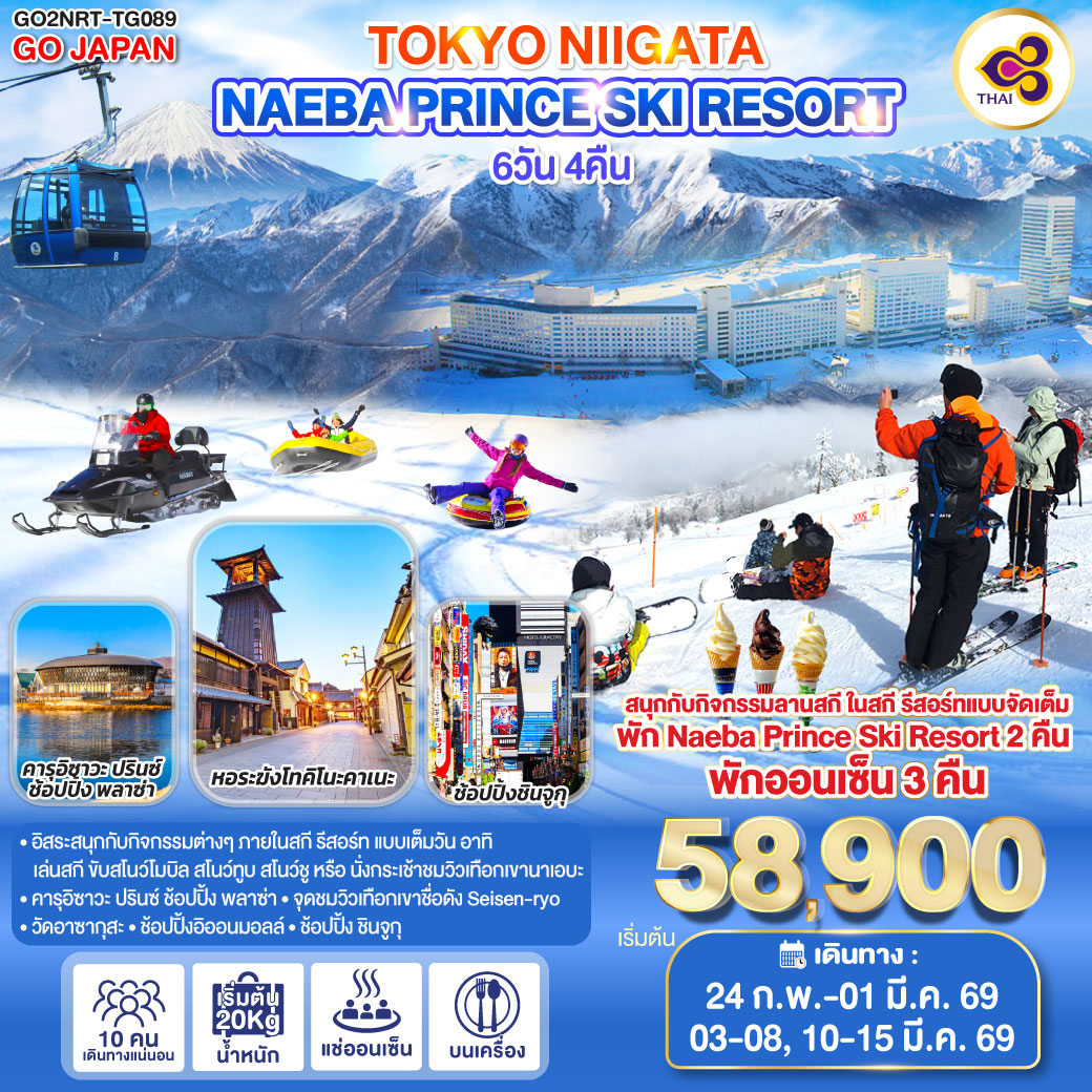 ทัวร์ฮอกไกโด เช็คอินหมู่บ้านนิงเกิ้ลเทอเรส ลานสกีชิคิไซ พาโนราม่า 6 วัน 4 คืน อิสระท่องเที่ยว 1 วัน (บินการบินไทย TG)