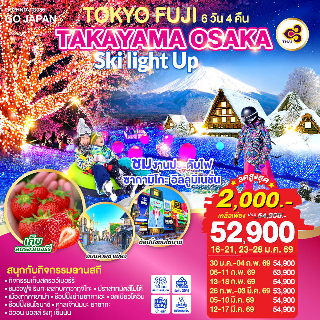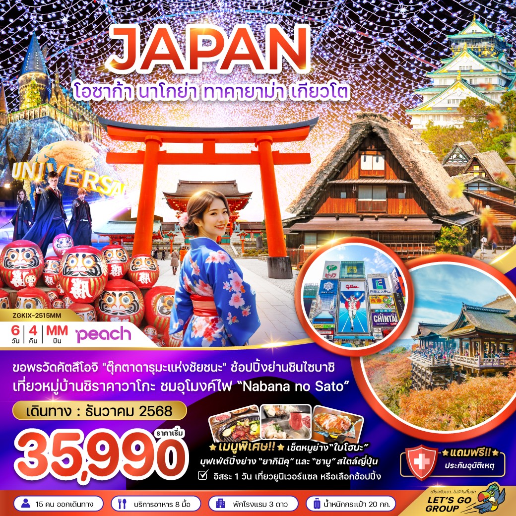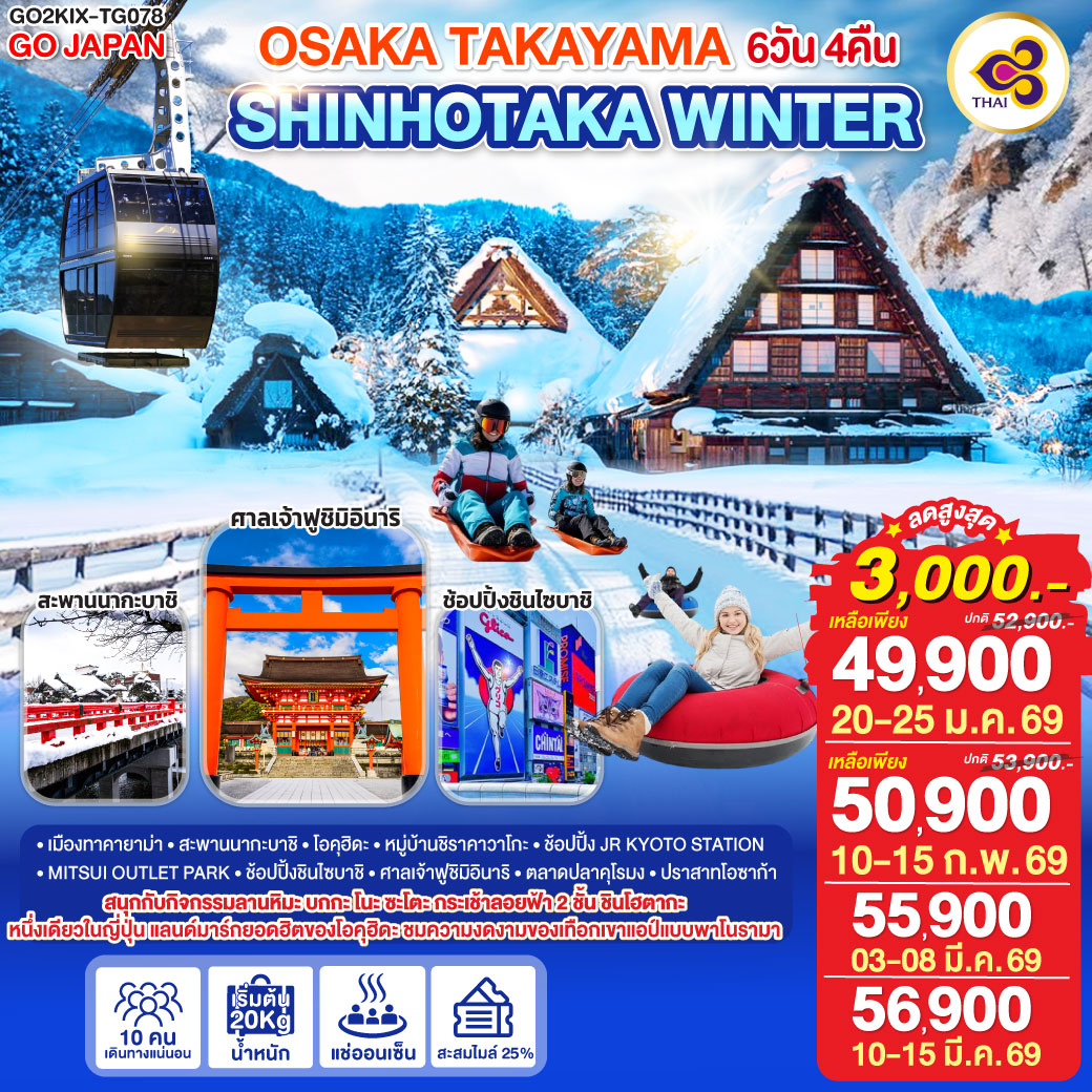 ทัวร์ญี่ปุ่น โอซาก้า ตะลุยหิมะ ชมงานประดับไฟนาบานะโนะ ซาโตะ ล่องเรือทะเลสาบฮามานะ เกียวโต 6 วัน 4 คืน (พักออนเซ็น 1 คืน)