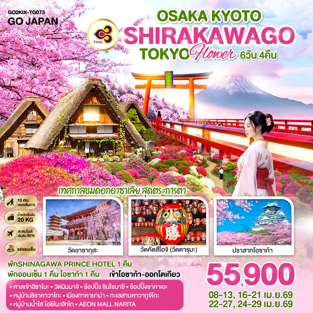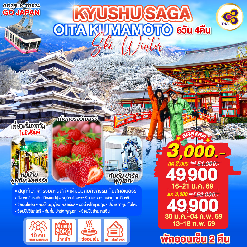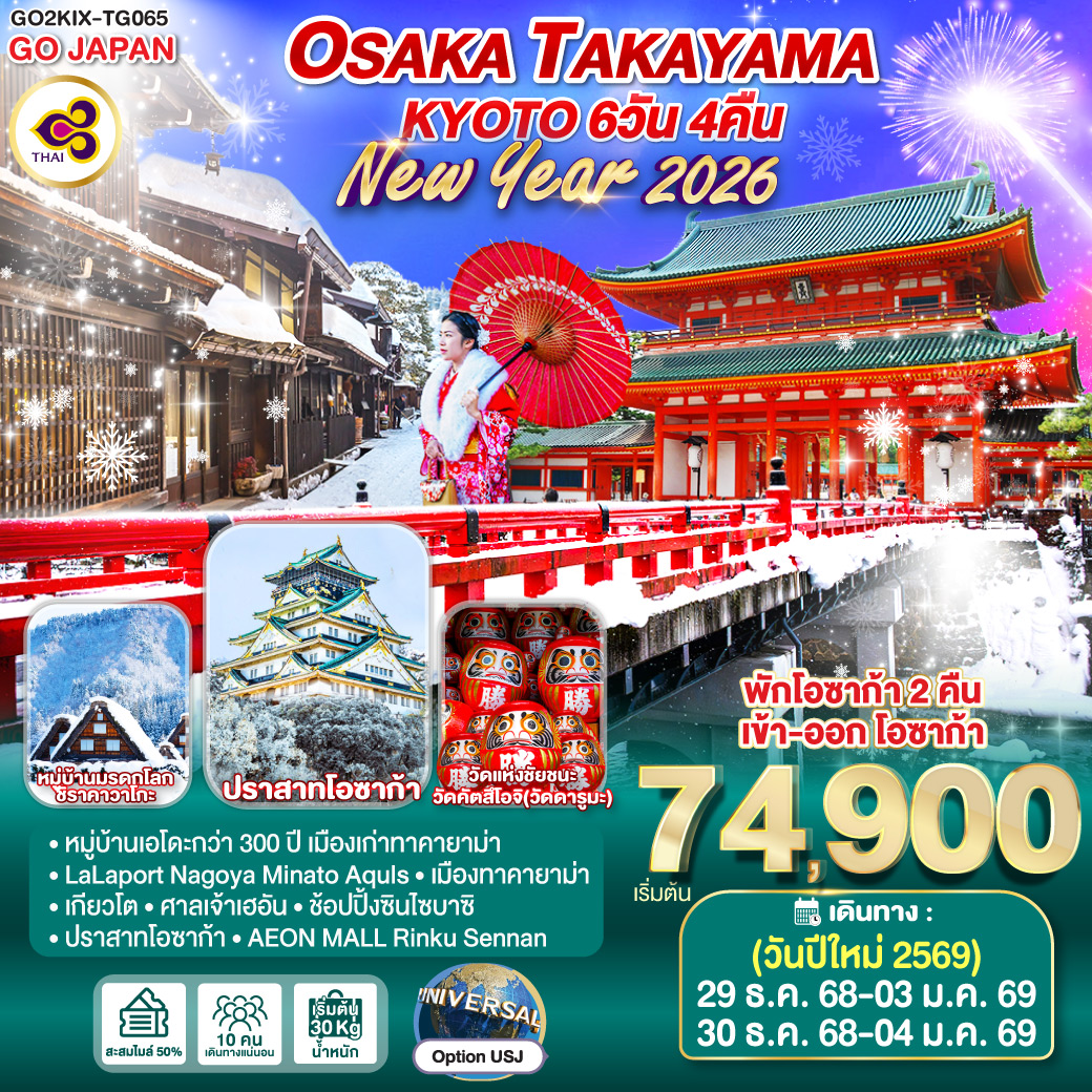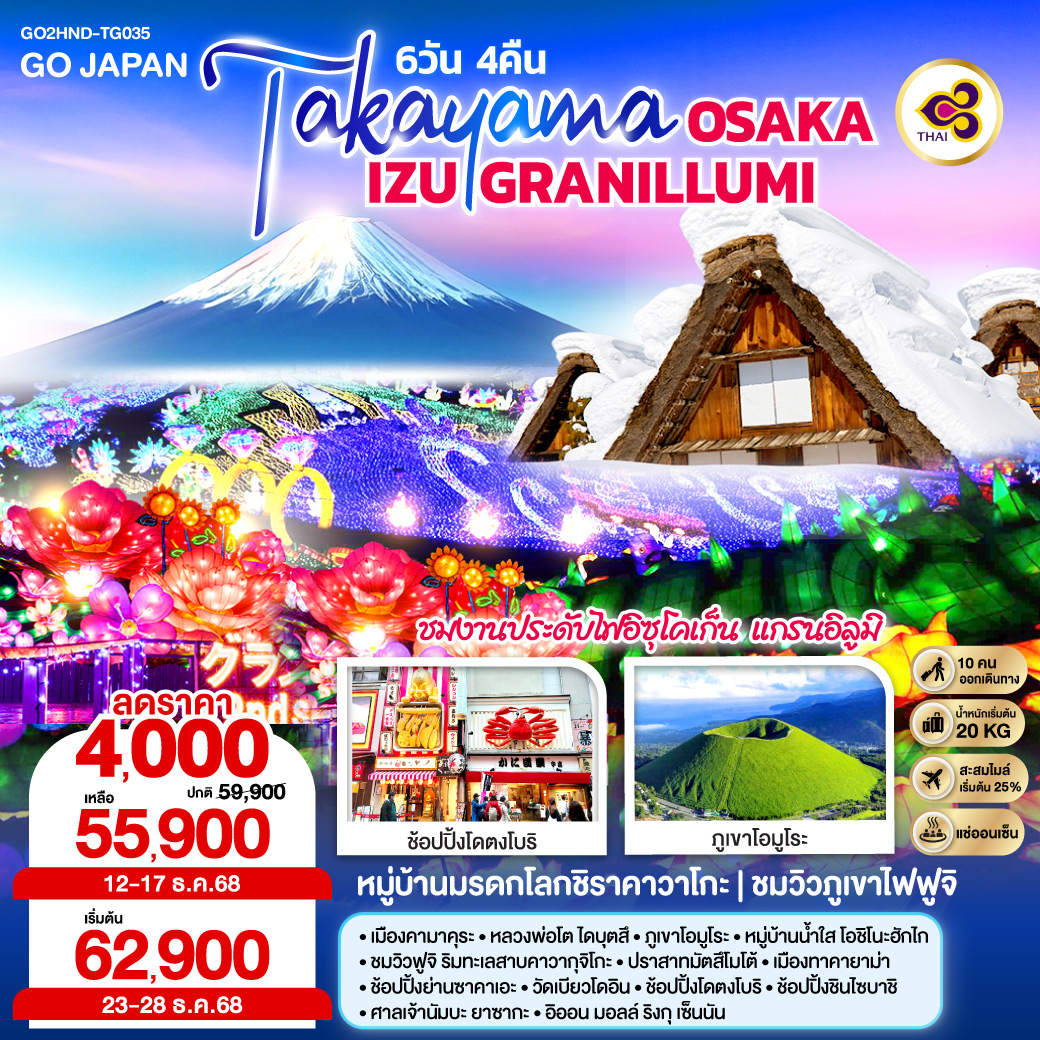 ทัวร์ญี่ปุ่น โอซาก้า ตะลุยหิมะ ชมงานประดับไฟนาบานะโนะ ซาโตะ ล่องเรือทะเลสาบฮามานะ เกียวโต 6 วัน 4 คืน (พักออนเซ็น 1 คืน)