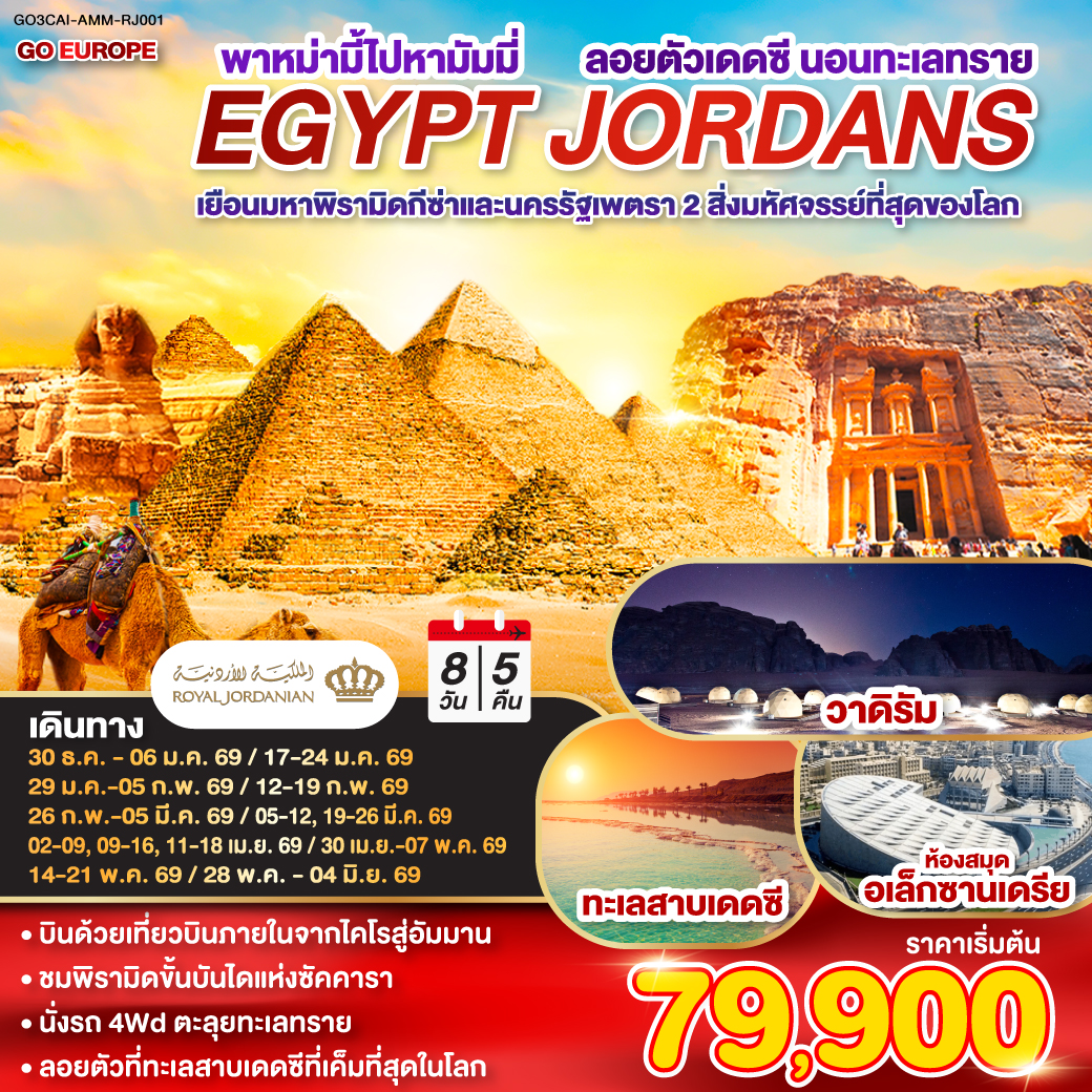 ทัวร์อียิปต์ ปีใหม่ 2569 เยือนมหาพิรามิดกีซ่า นครรัฐเพตรา 2 สิ่งมหัศจรรย์ที่สุดของโลก ขึ้นรถ4 WD ตะลุยทะเลทราย ล่องเรือท้องกระจก ทะเลสาบเดดซี 8 วัน 5 คืน (ทะเลที่มีความเค็มที่สุดในโลก)