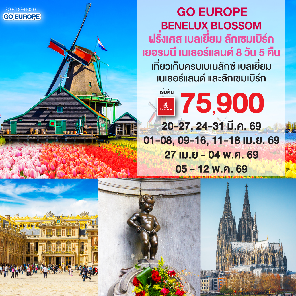 ทัวร์ยุโรป เบเนลักซ์ เยอรมนี เนเธอร์แลนด์ เบลเยียม ฝรั่งเศส เทศกาลชมทุ่งดอกทิวลิป พระราชวังแวร์ซายส์ ล่องเรืออ้มสเตอร์ดัม 8 วัน 5 คืน รวมค่าล่องเรือ (พักโรงแรมระดับ 4 ดาว)