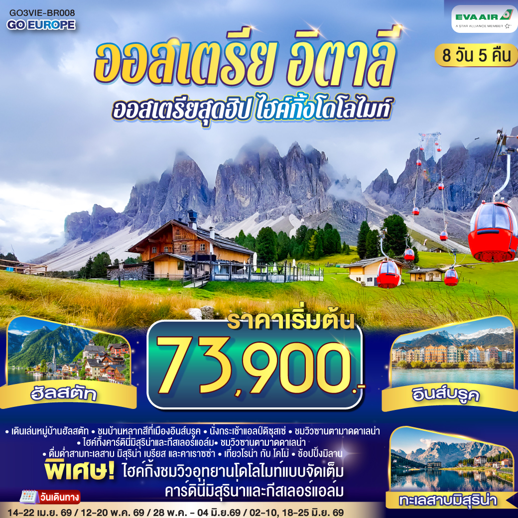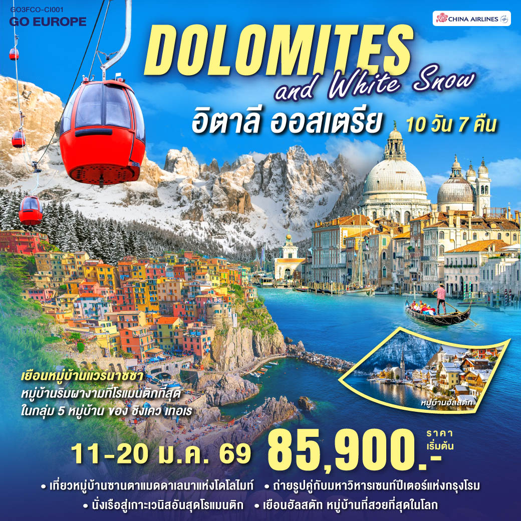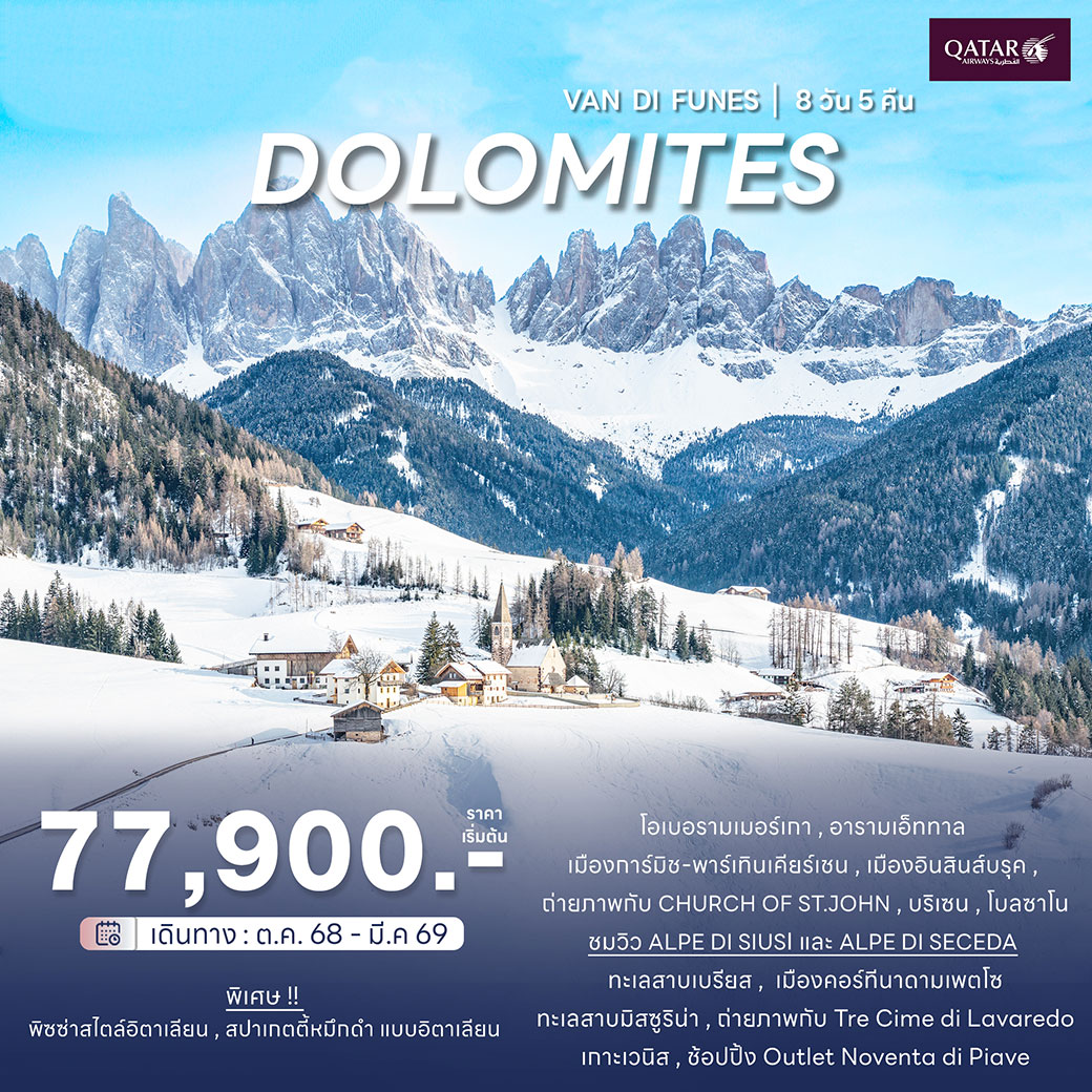ทัวร์อิตาลี โดโลไมท์ 2569 หมู่บ้านโอเบอร์อัมเมอร์เกา โบสถ์เซนต์จอห์น แอล์ป เดอ ซุสซิ เกาะเวนิส ล่องเรือกอนโดล่า 8 วัน 5 คืน สายการบิน Qatar Airway (พักโรงแรม 4 ดาว)