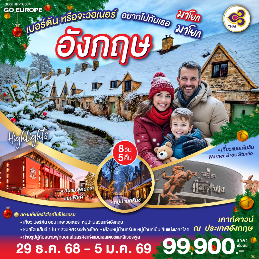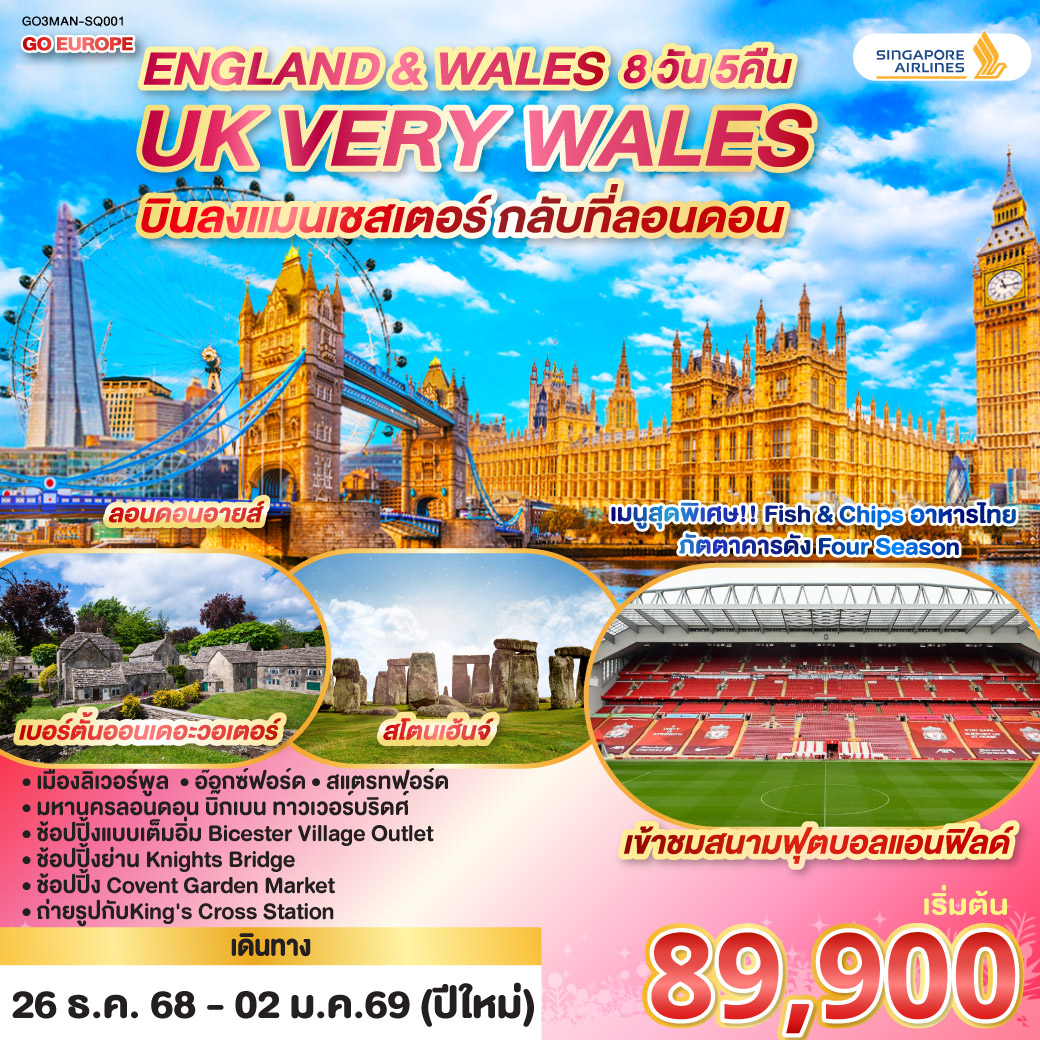ทัวร์อังกฤษ ปีใหม่ 2569 ลอนดอน แมนเชสเตอร์ ลิเวอร์พูล สโตนเฮ้นจ์ 8 วัน 5 คืน (อิสระฟรีเดย์ เต็มวัน)