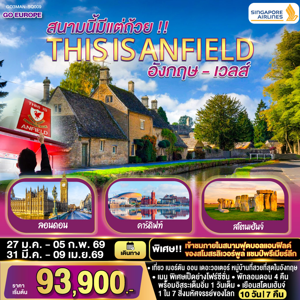 ทัวร์อังกฤษ สกอตแลนด์ เวลส์ 2569 ปราสาทเอดินเบิร์ก ล่องเรือทะเลสาบวินเดอร์เมียร์ สนามฟุตบอลแอนฟิลด์ อ็อกซ์ฟอร์ด สโตนเฮนจ์ Harry Potter ล่องเรือแม่น้ำเทมส์ 10 วัน 7 คืน (พักโรงแรม 4 ดาว)