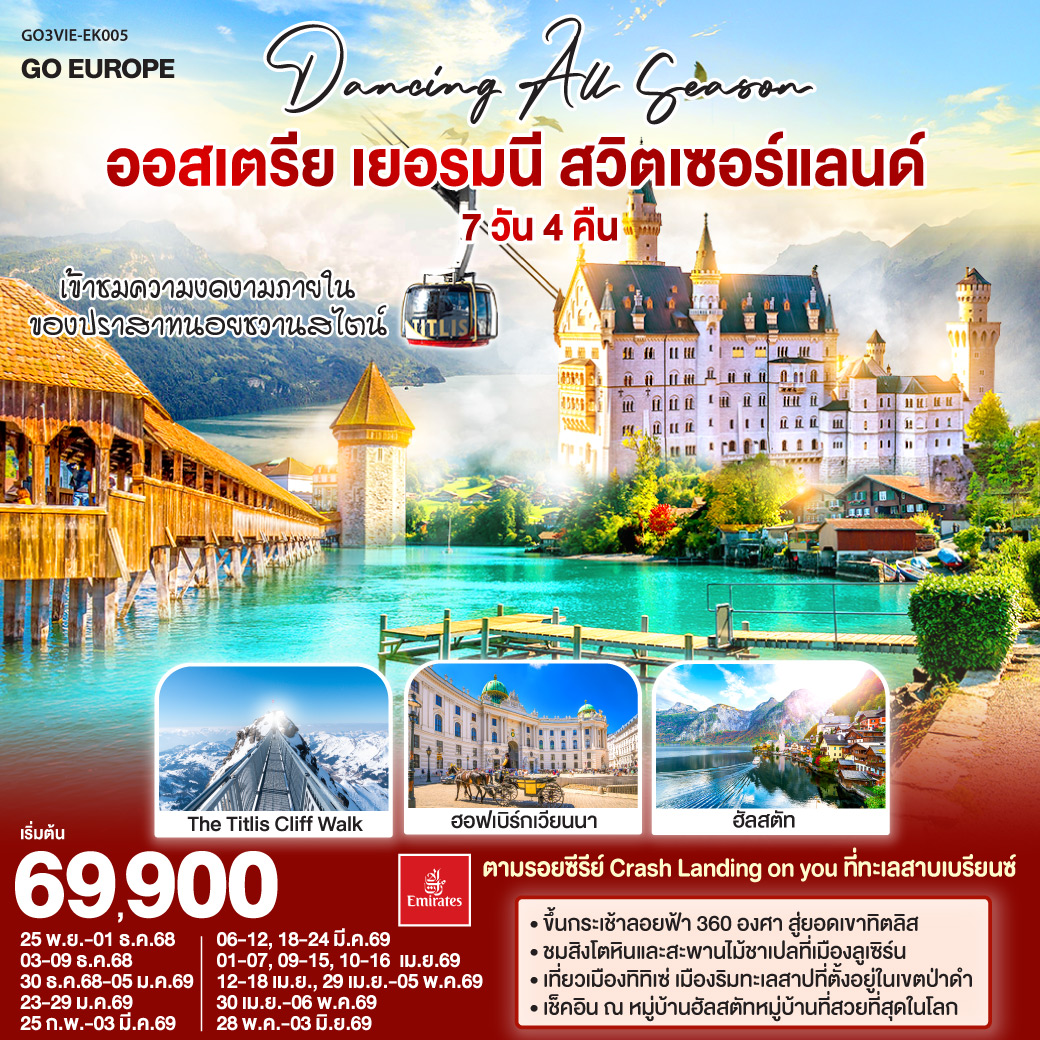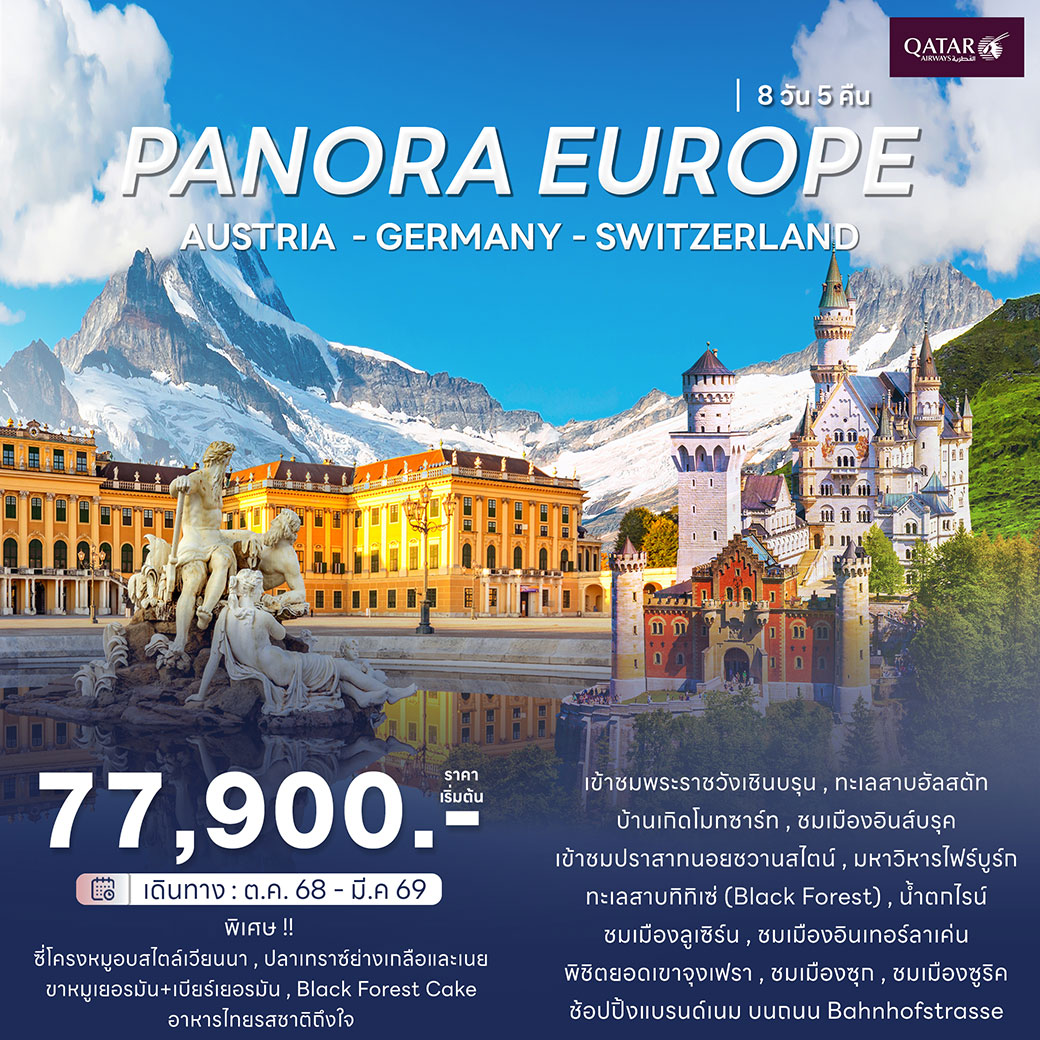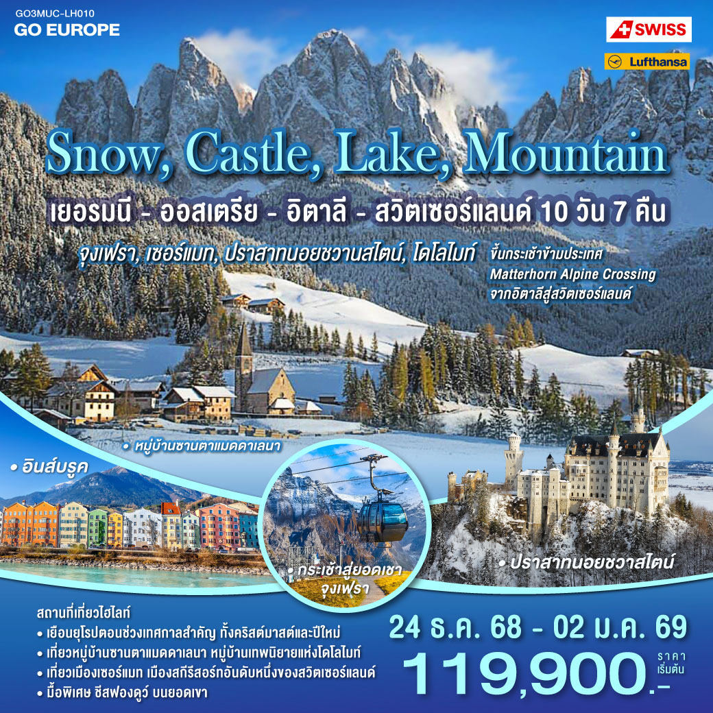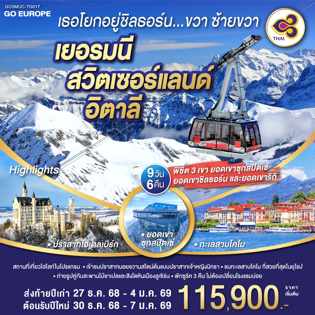 ทัวร์ยุโรป ปีใหม่ 2026 อิตาลี ออสเตรีย เยอรมัน สวิตเซอร์แลนด์ ปราสาทนอยชวานสไตน์ น้ำตกไรน์ อนุสาวรีย์สิงโตแห่งลูเซิร์น จตุรัสมาเรียนพลัทซ์ 8 วัน 5 คืน (พิเศษ เข้าชม Swaroveki Crystal Worlde)