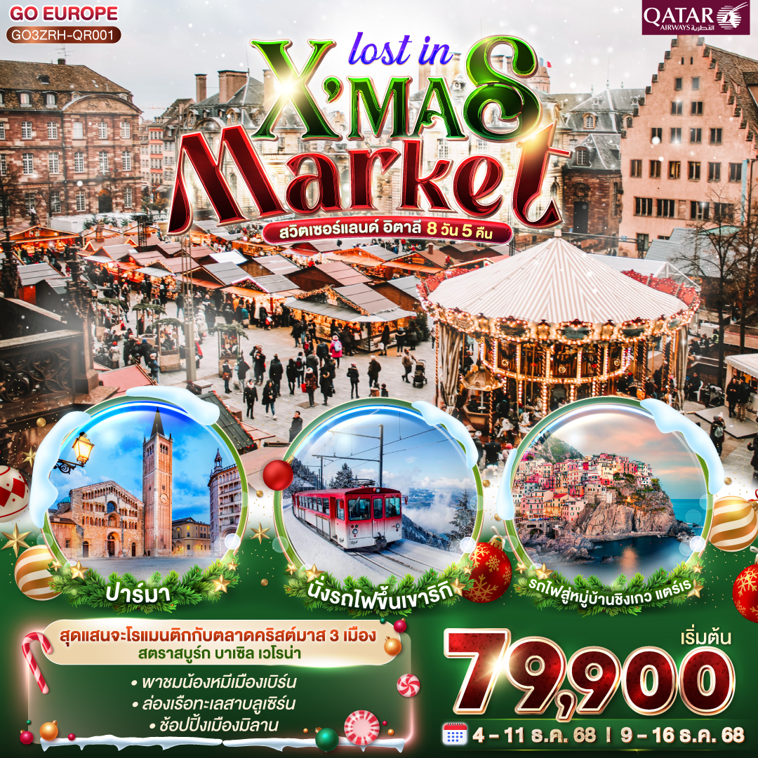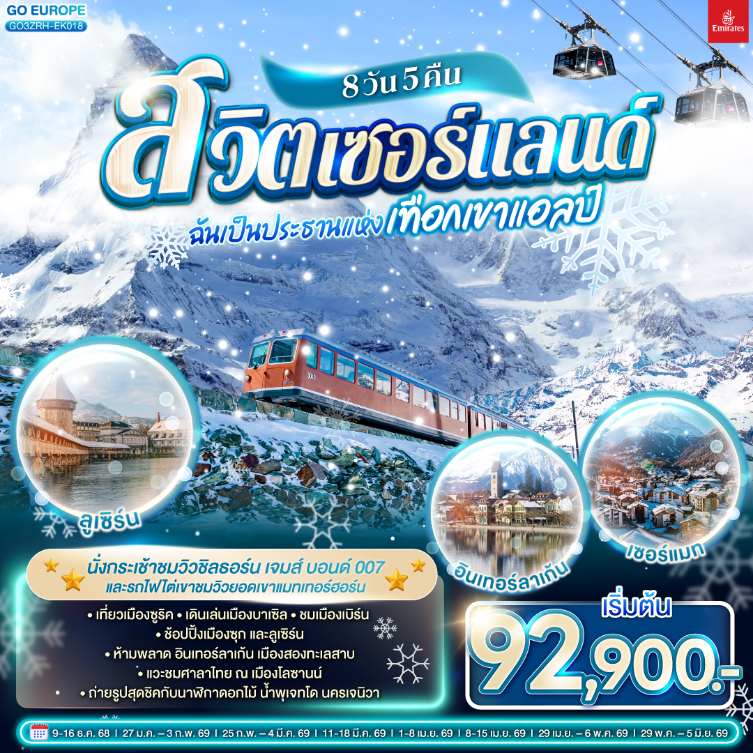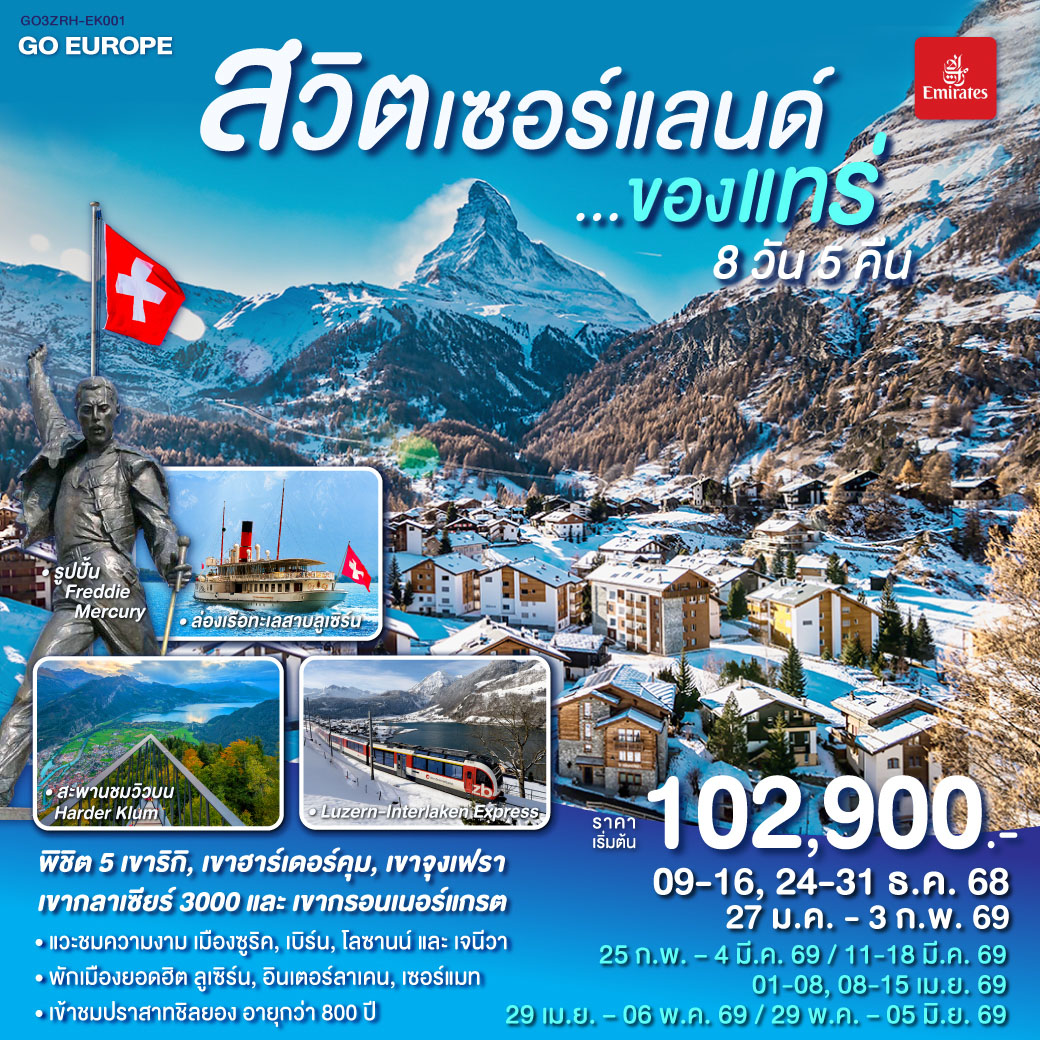 ทัวร์สวิตเซอร์แลนด์ The magic & Christmas เซอร์แมท รถไฟไต่เขาสู่ยอดเขาริกิ ตลาดคริสต์มาส 8 วัน 6 คืน (ชมซานตาคลอสบินได้)