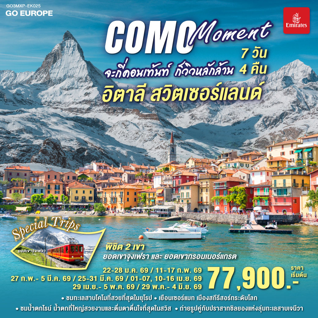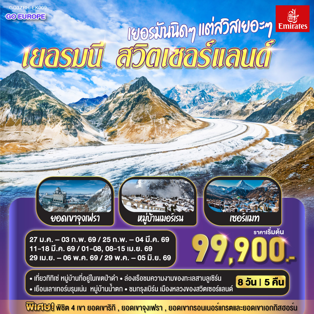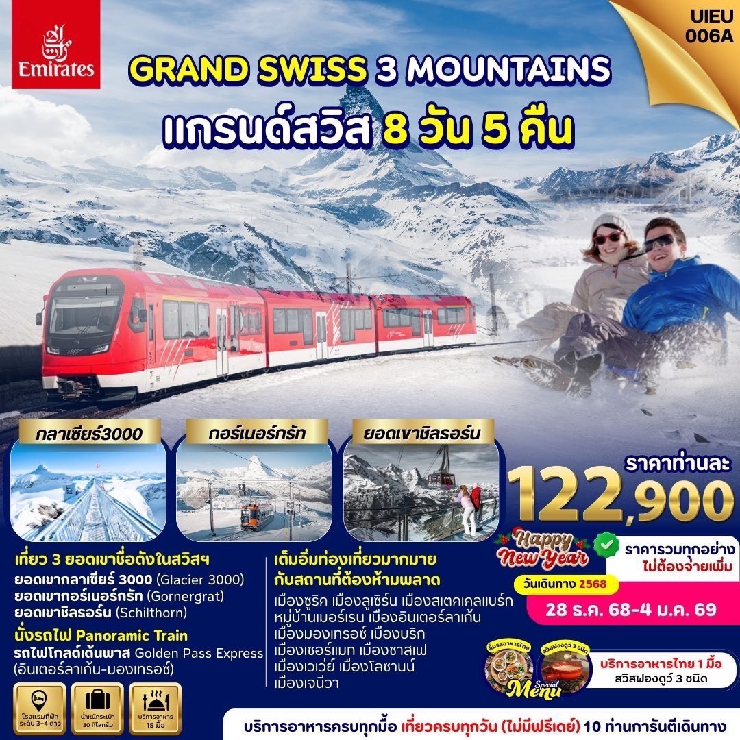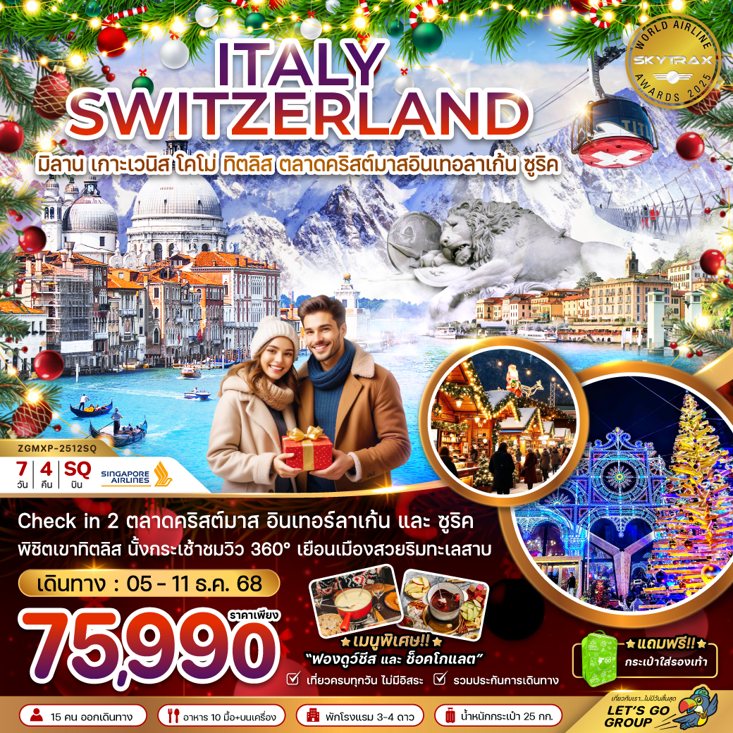 ทัวร์สวิตเซอร์แลนด์ The magic & Christmas เซอร์แมท รถไฟไต่เขาสู่ยอดเขาริกิ ตลาดคริสต์มาส 8 วัน 6 คืน (ชมซานตาคลอสบินได้)