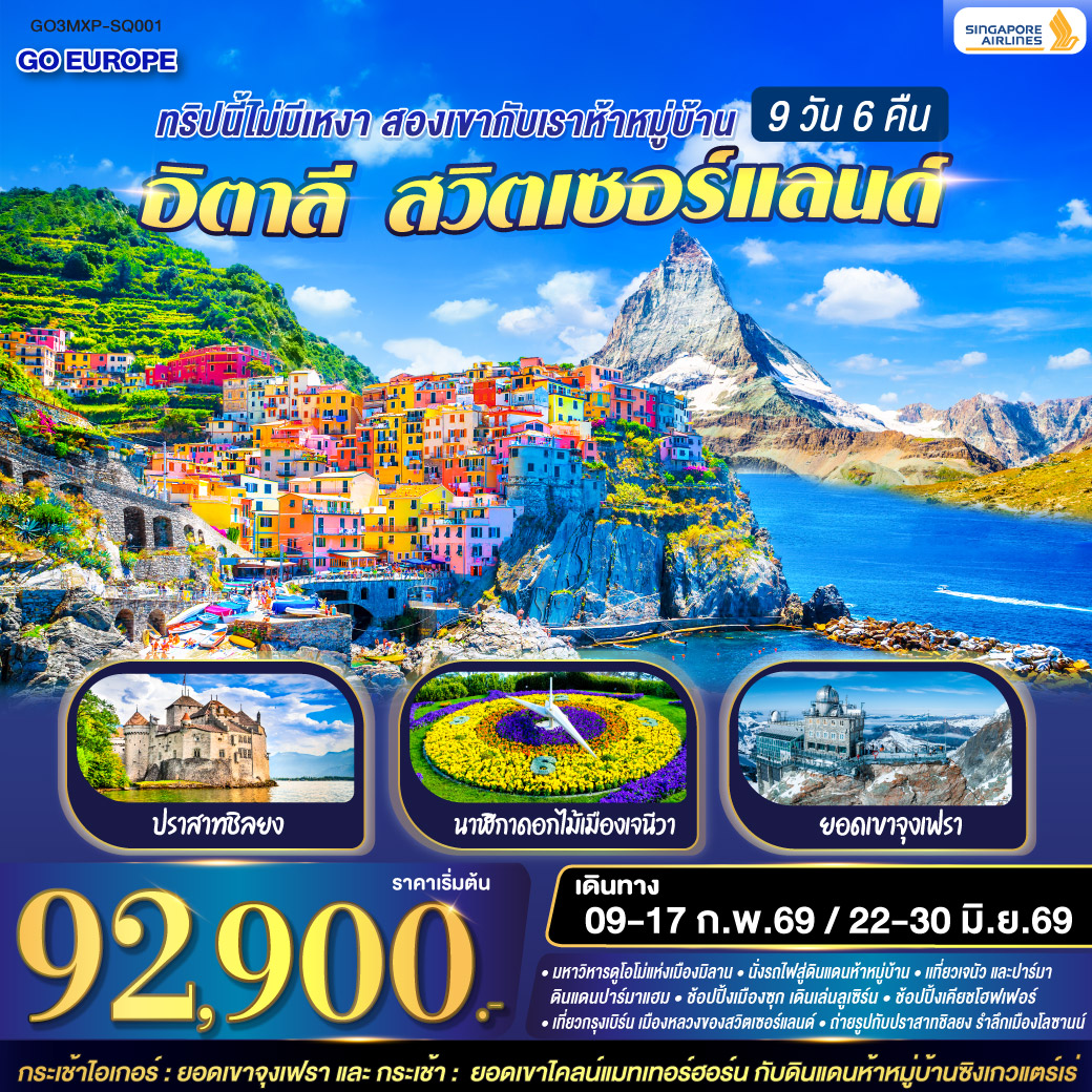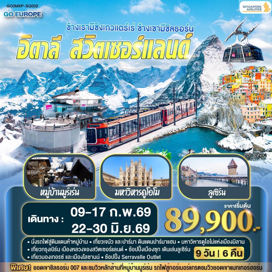 ทัวร์ยุโรป 2569 สวิตเซอร์แลนด์ อิตาลี ซิงเคว แตร์เร่ เซอร์แมท ยอดเขาชิลธอร์น หมู่บ้านมูร์เร่น 9 วัน 6 คืน สายการบิน Singapore (SQ)