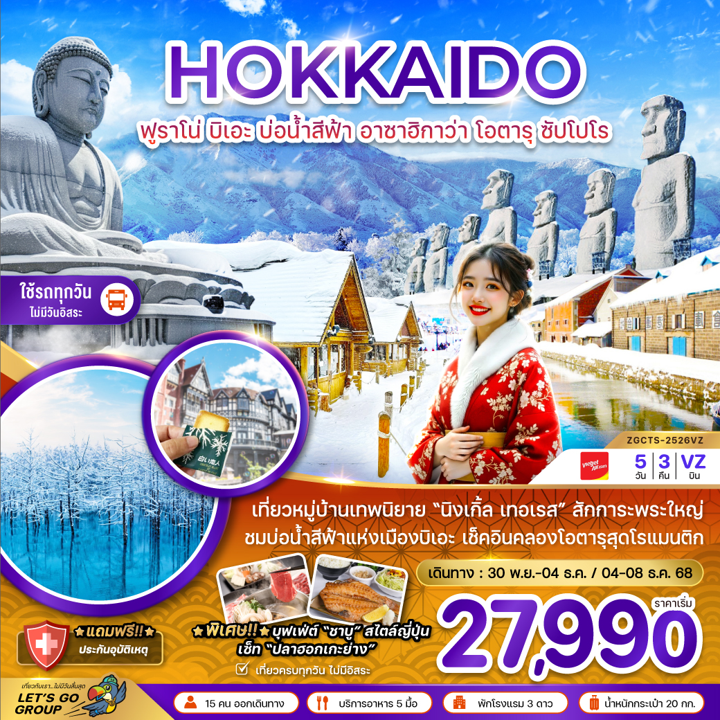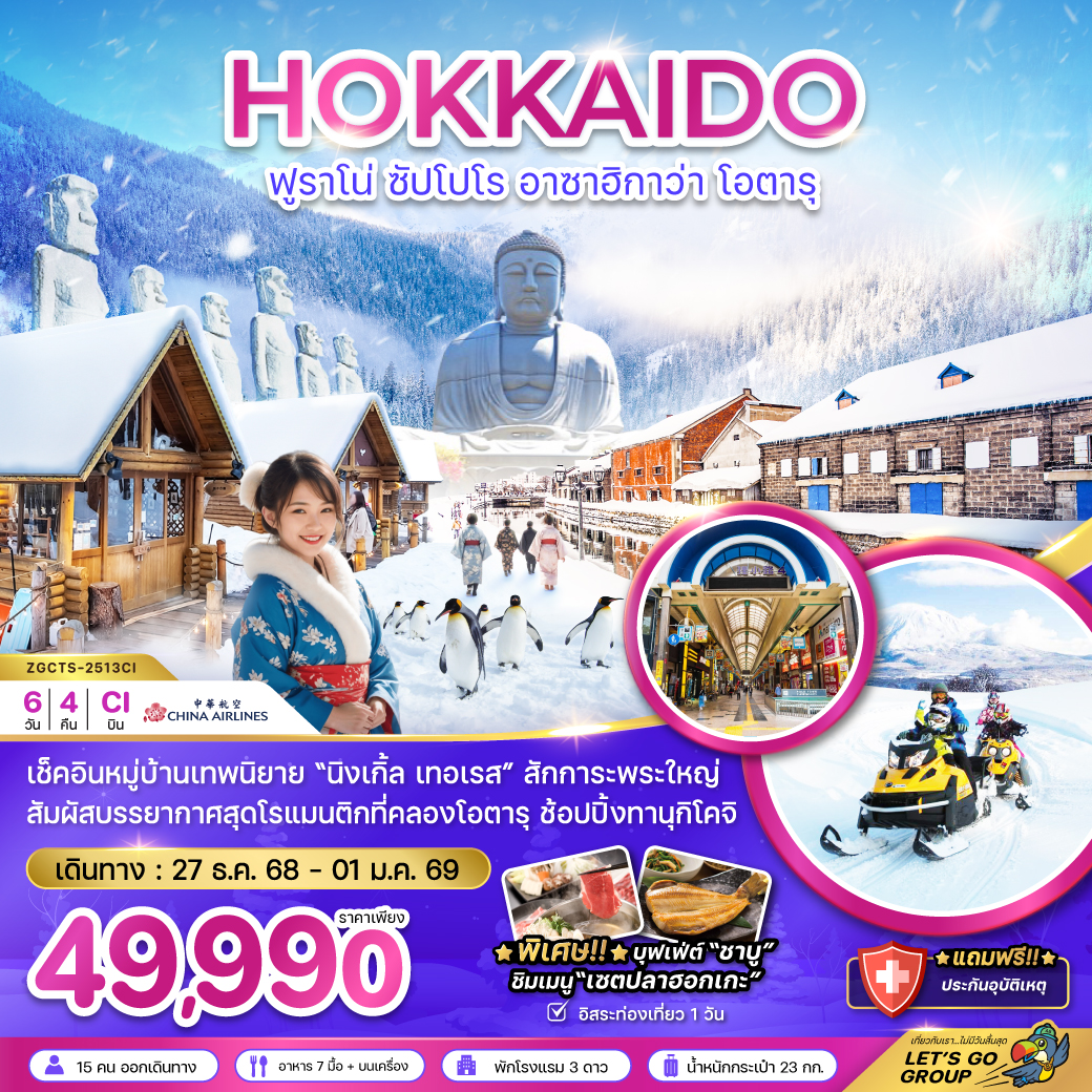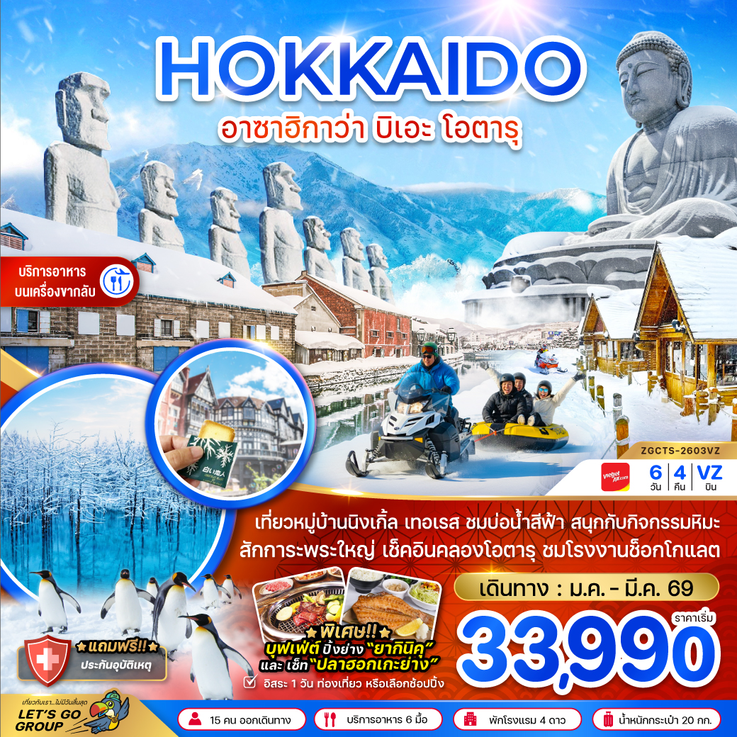 ทัวร์ฮอกไกโด ปีใหม่ 2569 ตะลุยแดนหิมะ เนินเขาแห่งพระพุทธเจ้า นิงเกิ้ลเทอเรส น้ำตกชิราฮิเกะ โอตารุ 6 วัน 4 คืน (พักซัปโปโรในเมือง 3 คืน พักออนเซ็น 1 คืน)