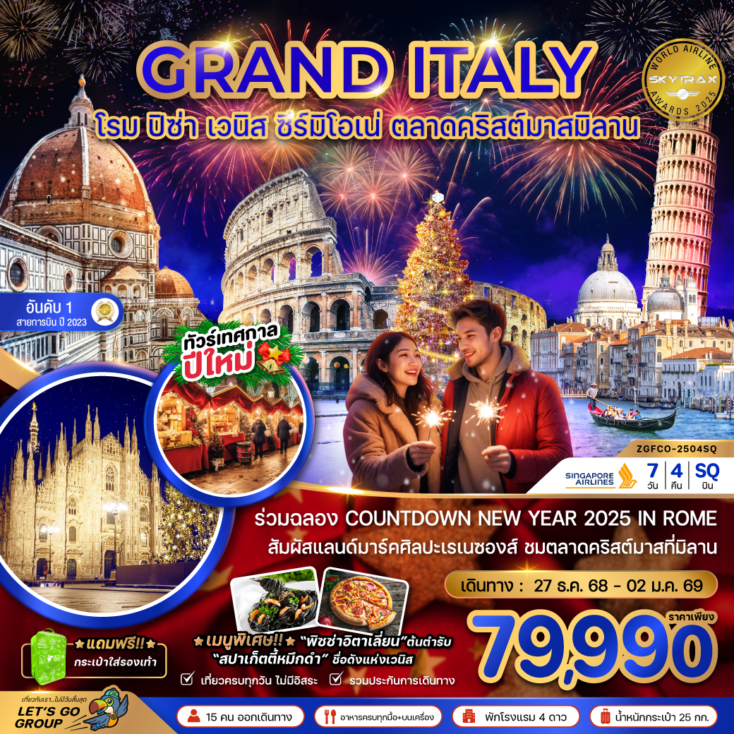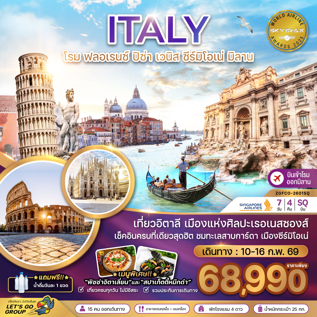 ทัวร์อิตาลี หอเอนแห่งเมืองปิซ่า โคลอสเซียม ล่องเรือเกาะเวนิส ปราสาทเก่าเมืองซีร์มิโอเน่ 7 วัน 4 คืน (อันดับ 1 สายการบิน QATAR ปี 2024)