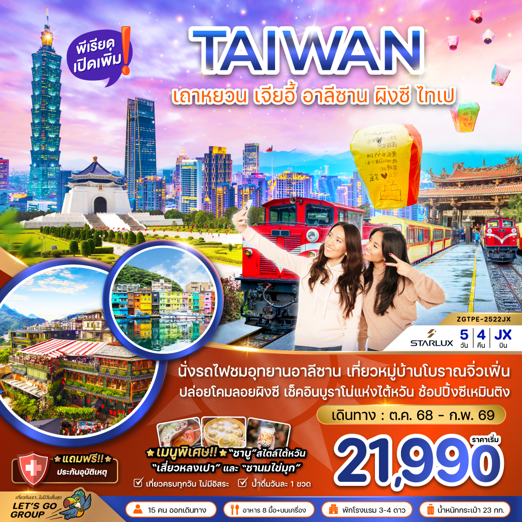 ทัวร์ไต้หวัน เคาท์ดาวน์ปีใหม่ 2569 เถาหยวน เจียอี้ อาลีซาน ผิงซี ไทเป นั่งรถไฟชมอุทยานอาลีซาน ปล่อยโคมลอยผิงซี 5 วัน 4 คืน (รวมรถรับส่งเคาท์ดาวน์)