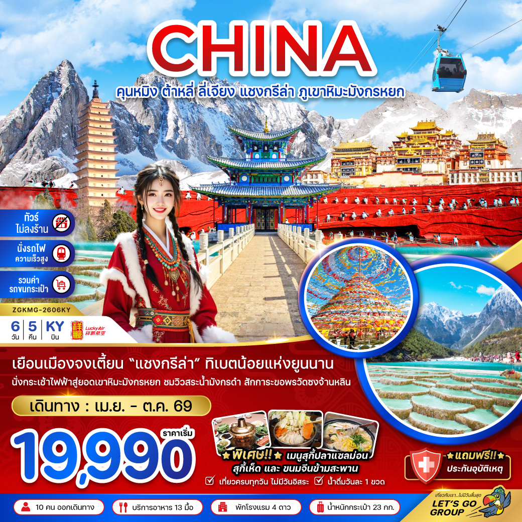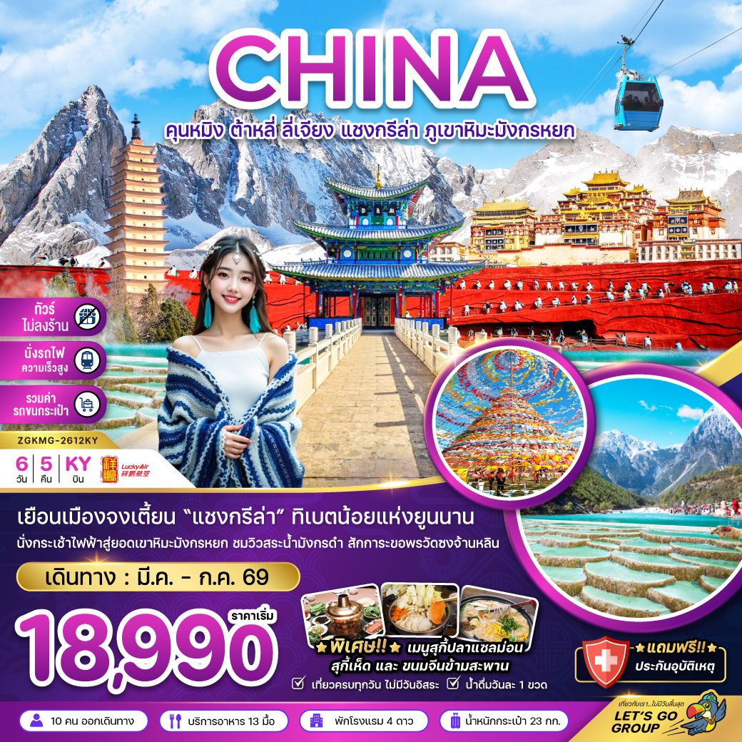 ทัวร์คุนหมิง 2569 ต้าลี่ ลี่เจียง แชงกรีล่า ภูเขาหิมะมังกรหยก ชมเทศกาลดอกศรีตรัง 6 วัน 5 คืน (ทัวร์ไม่ลงร้านช้อป) นั่งรถไฟความเร็วสูง