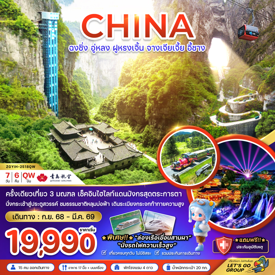 ทัวรฉงชิ่ง อู่หลง ฝูหรงเจิ้น จางเจียเจี้ย อี้ชาง นั่งกระเช้าสู่ประตูสวรรค์ ล่องเรือเขื่อนสามผา รถไฟฟ้าทะลุตึก 7 วัน 6 คืน (นั่งรถไฟความเร็วสูง) เที่ยวครบทุกวัน ไม่มีอิสระ