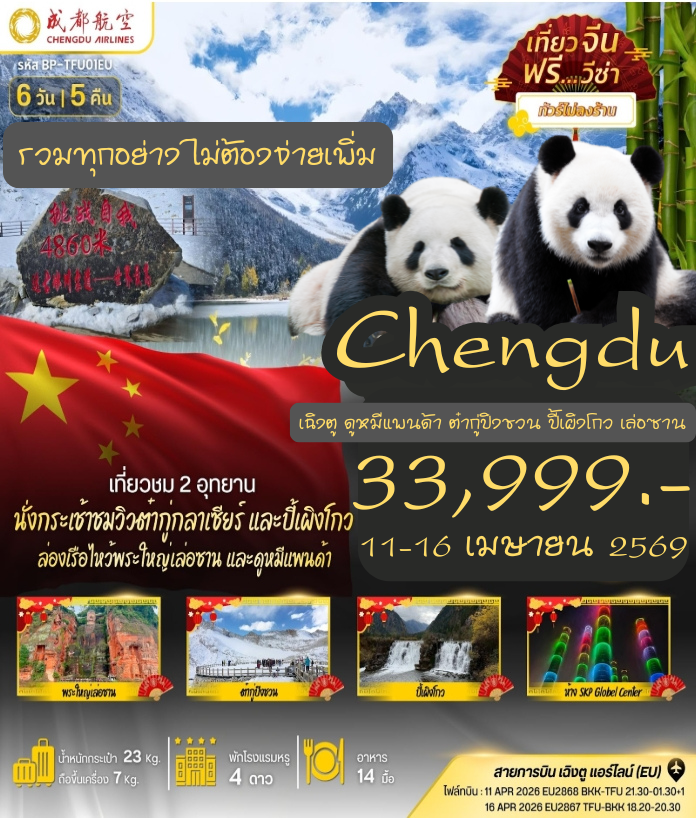 ทัวร์เฉิงตู สงกรานต์ 2569 เที่ยวชม 2 อุทยาน นั่งกระเช้าชมวิวต๋ากู่กลาเซียร์ ปี้เผิงโกว ล่องเรือไหว้พระใหญ่เล่อซาน ะดูหมีแพนด้า 6 วัน 5 คืน ทัวร์ไม่ลงร้านช้อป (พักหรูโรงแรม 4 ดาวทุกคืน) รวมค่าทิปไกด์ท้องถิ่นและคนขับรถแล้ว