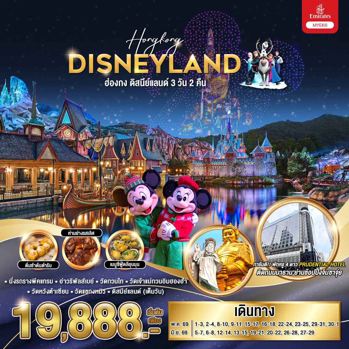 กรุงเทพฯ (สุวรรณภูมิ) – ฮ่องกง – เช็คอินอ่าววิคตอเรีย - สวนสนุกดิสนีย์แลนด์เต็มวัน - (นั่งรถรางพีคแทรม) สู่ยอดเขาวิคตอเรียพีค - อ่าวรีพัลส์เบย์ – วัดกวนไท – วัดเจ้าแม่กวนอิมฮองฮำ - วัดหวังต้าเซียน – ศูนย์รวมฮวงจุ้ยกังหันนำโชค – วัดแชกงหมิว - ฮ่องกง - กรุงเทพฯ (สุวรรณภูมิ)