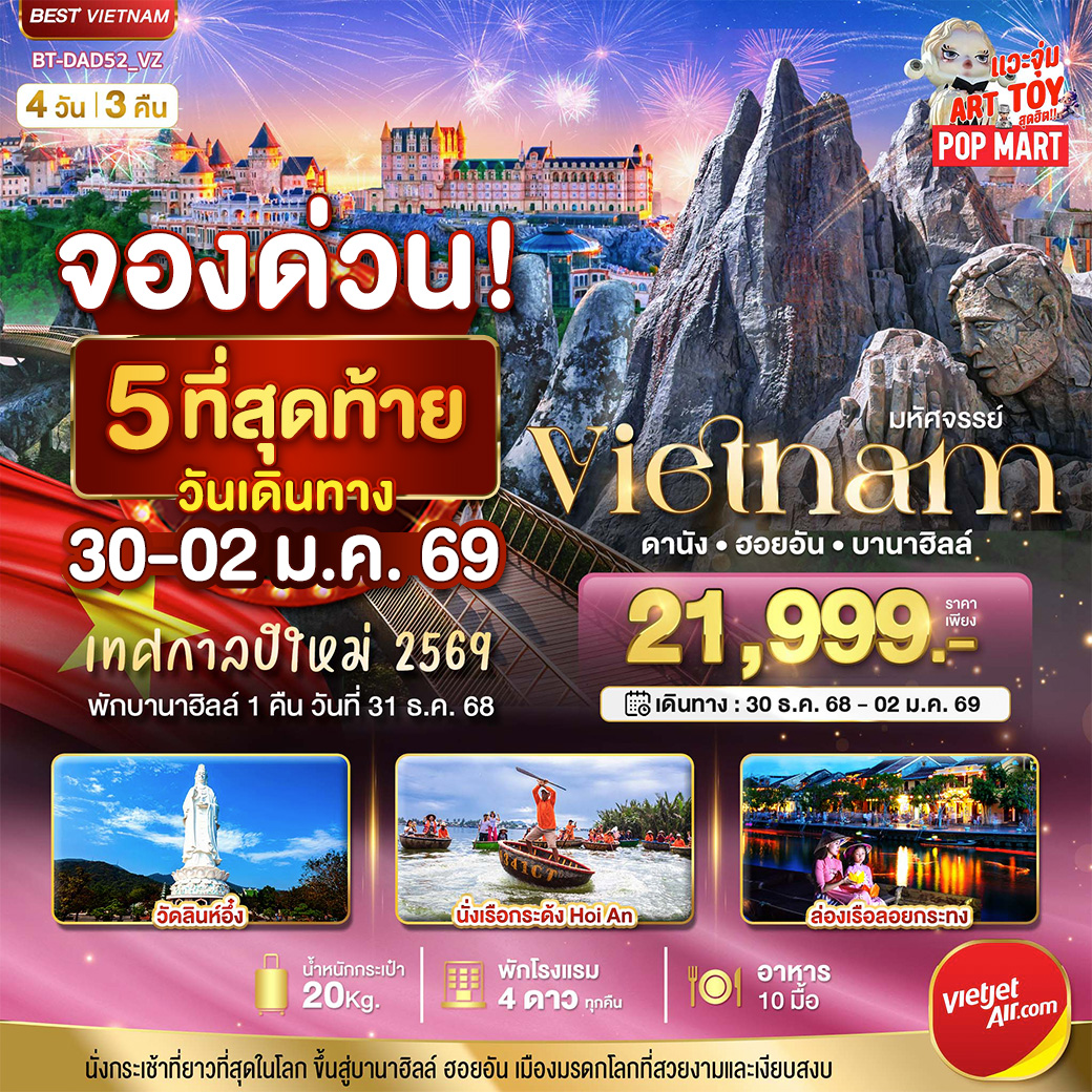 ทัวร์เวียดนามกลาง เทศกาลปีใหม่ 2569 ดานัง ฮอยอัน ล่องเรือลอยกระทง นั่งเรือกระดัง Hoi An 4 วัน 3 คืน (พักบาน่าฮิลล์)