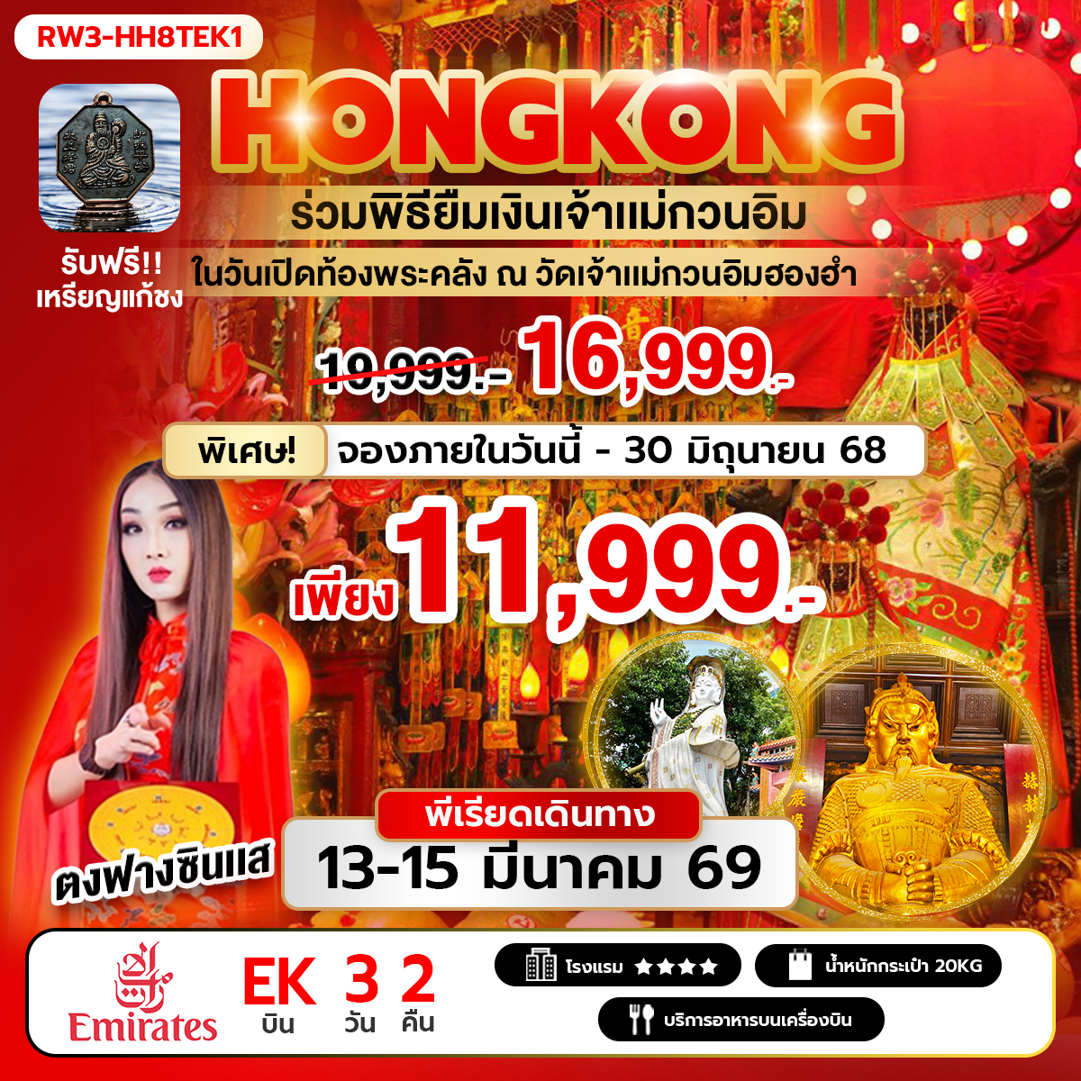 กรุงเทพฯ (สุวรรณภูมิ) – ฮ่องกง (เช็กแล็บก็อก) - ร่วมพิธียืมเงินเจ้าแม่กวนอิม ณ วัดเจ้าแม่กวนอิมฮองฮำ ในวันเปิดท้องพระคลังเจ้าแม่กวนอิม เทพเปลี่ยนใจ วัดปักไตฮองฮำ – เทพเจ้ากวนอู วัดกวนไท – วัดนาจา ช้อปปิ้งย่านจิมซาจุ่ย - เจ้าแม่กวนอิม รีพัลส์เบย์ – วัดหลินฟ้า วัดหวังต้าเซียน – โรงงานกังหันฮวงจุ้ย FORTUNE JEWELRY และ ร้านหยก – วัดแชกงหมิว สนามบินฮ่องกง (เช็กแล็บก็อก) – กรุงเทพฯ (สุวรรณภูมิ)