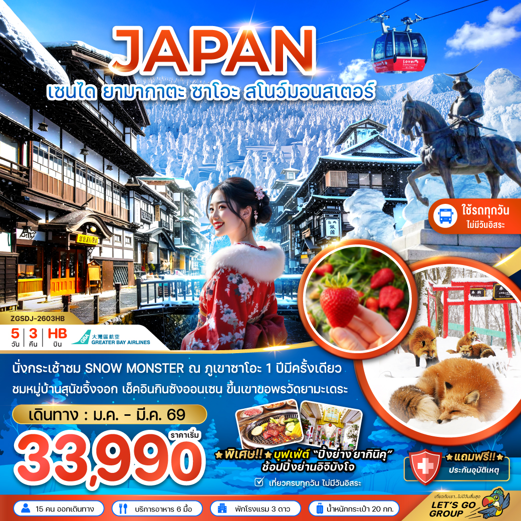 ทัวร์ญี่ปุ่น เซนได ปีใหม่ 2569 ยามากาตะ ซาโอะ สโนว์มอนสเตอร์ หมู่บ้านสุนัขจิ้งจอก กินซังออนเซ็น 5 วัน 3 คืน (เที่ยวครบทุกวัน) ใช้รถทุกวัน ไม่มีวันอิสระ