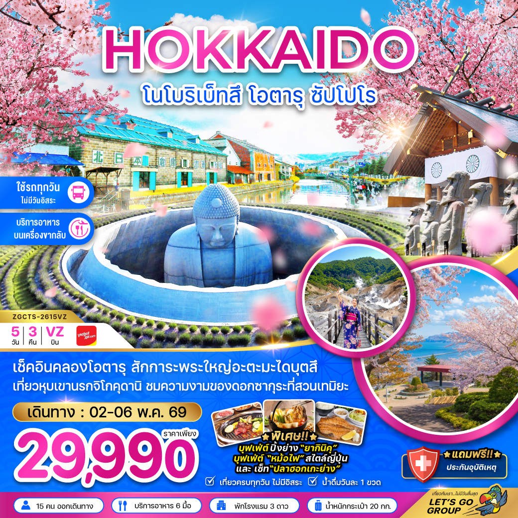 ทัวร์ฮอกไกโด 2569 โนโบริเบ็ทสึ คลองโอตารุ ซัปโปโร พระใหญ่อะตะมะไดบุตสึ หุบเขานรกจิโกคุดานิ ดอกซากุระที่สวนเทมิยะ 5 วัน 3 คืน ใช้รถทุกวัน ไม่มีวันอิสระ (บริการอาหารบนเครื่องขากลับ)