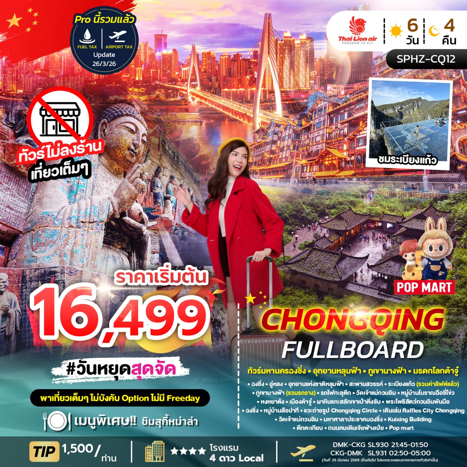 กรุงเทพฯ (สนามบินดอนเมือง) – ฉงชิ่ง - ท่าอากาศยานนานาชาติฉงชิ่งเจียงเป่ย์ – ฉงชิ่ง – อู่หลง – อุทยานแห่งชาติหลุมฟ้า สะพานสวรรค์ – ระเบียงแก้ว (รวมค่าลิฟต์แล้ว) - ภูเขานางฟ้า (รวมรถราง) – ฉงชิ่ง – รถไฟทะลุตึก – หมู่บ้านโบราณฉือชี่โข่ว – หงหยาต้ง - เมืองต้าจู๋ – ผาหินเเกะสลักเขาเป่าติ่งชัน – พระโพธิสัตว์กวนอิมพันมือ – ฉงชิ่ง – หมู่บ้านสือปาที – ถ่ายรูป Chongqing Circle – เดินเล่น Raffles City Chongqing - วัดเจ้าแม่กวนอิม – มหาศาลาประชาคมฉงชิ่ง – Kuixing Building – ตึกตะเกียบ – ถนนคนเดินเจียฟ่างเป่
