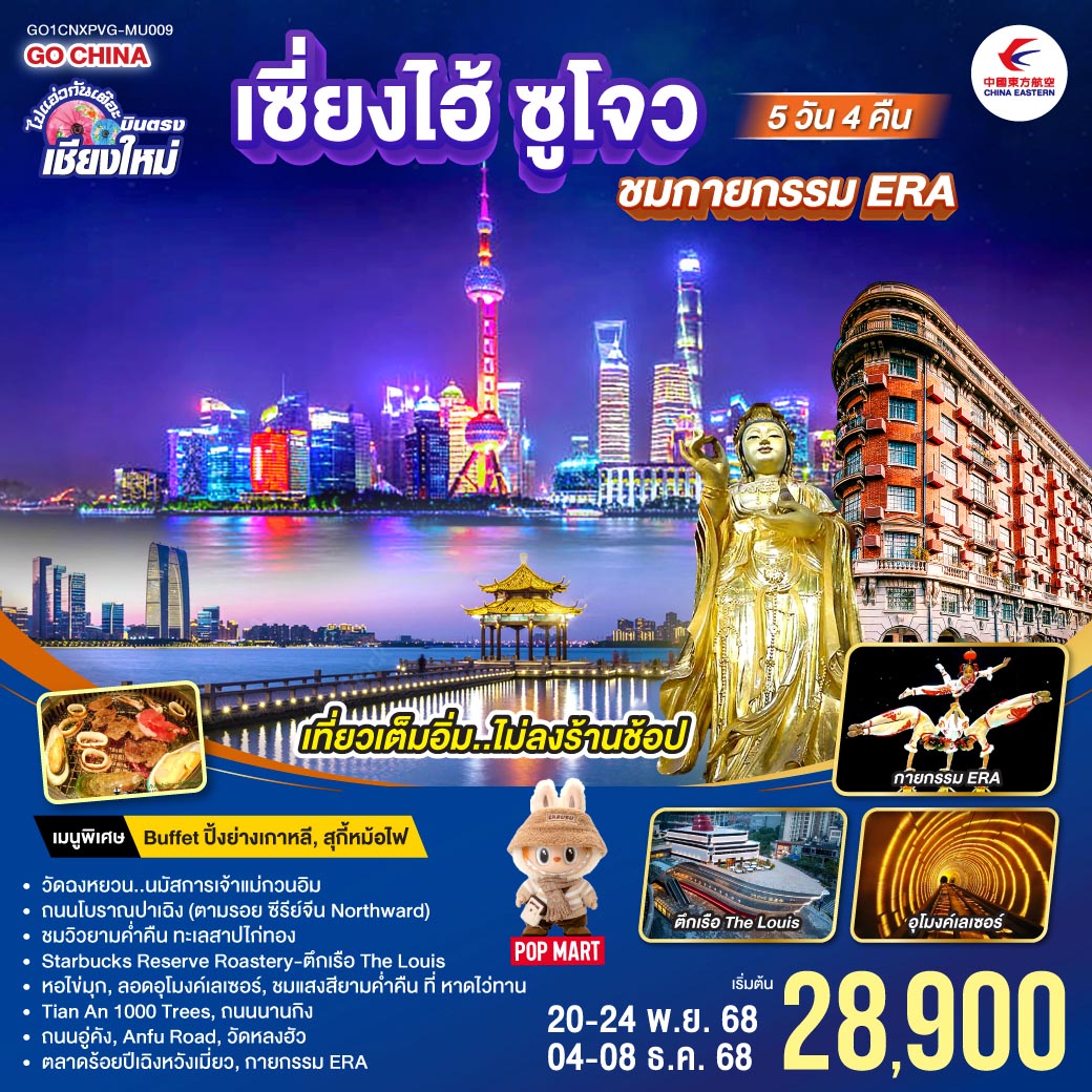 เชียงใหม่– เซี่ยงไฮ้ (สนามบินผู่ตง) - เซี่ยงไฮ้ – ซูโจว – วัดฉงหยวน – ถนนโบราณปาเฉิง - (ตามรอย ซีรีย์จีน Northward)-ทะเลสาบไก่ทอง - เซี่ยงไฮ้- Starbucks Reserve Roastery –ตึกเรือ The Louis - อาคารพันต้นไม้Tian An 1000Trees - ถนนนานกิง+ร้าน POPMART – ชมหอไข่มุก ลอดอุโมงค์เลเซอร์ - หาดไว่ทาน - ถนนอู่คัง – ถนนอันฝู – วัดหลงฮัวตลาดร้อยปีเฉิงหวังเมี่ยว – กายกรรม ERA - เซี่ยงไฮ้ (สนามบินผู่ตง) - เชียงใหม่