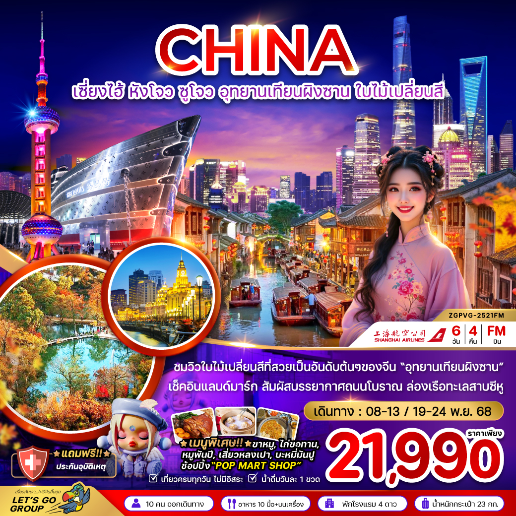 ทัวร์เซี่ยงไฮ้ หังโจว ซูโจว อุทยานเทียนผิงซาน ล่องเรือทะเลสาบซีหู ใบไม้เปลี่ยนสี 6 วัน 4 คืน (สายการบิน Shanghai Airlines)