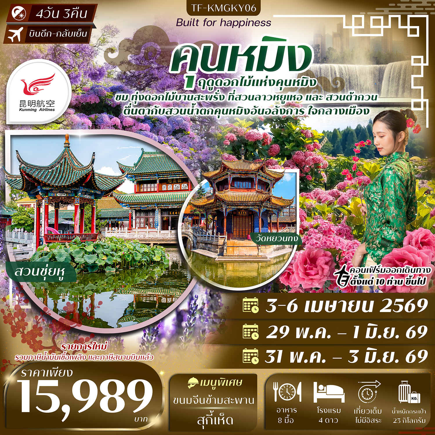 ทัวร์คุนหมิง สงกรานต์ 2569 ซิงอี้ ภูเขาหมื่นยอด ล่องเรือทะเลสาบวางเฟิง เมืองโบราณหลินปู้อี้ วัดหยวนทง ประตูม้าทองไก่หยก ชมสวนดอกไม้ตามฤดูกาล 4 วัน 3 คืน เที่ยวครบทุกวัน (พักโรงแรมระดับ 4 ดาว)