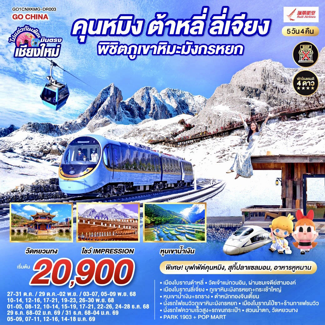 ทัวร์บินตรงเชียงใหม่ ปีใหม่ 2569 คุนหมิง ต้าหลี่ ลี่เจียง ภูเขาหิมะมังกรหยก วัดหยวนทง โชว์ IMPRESSION หุบเขาน้ำเงิน 5 วัน 4 คืน (ทัวร์ไม่ลงร้านช้อป) นั่งรถไฟความเร็วสูง 1 เที่ยว