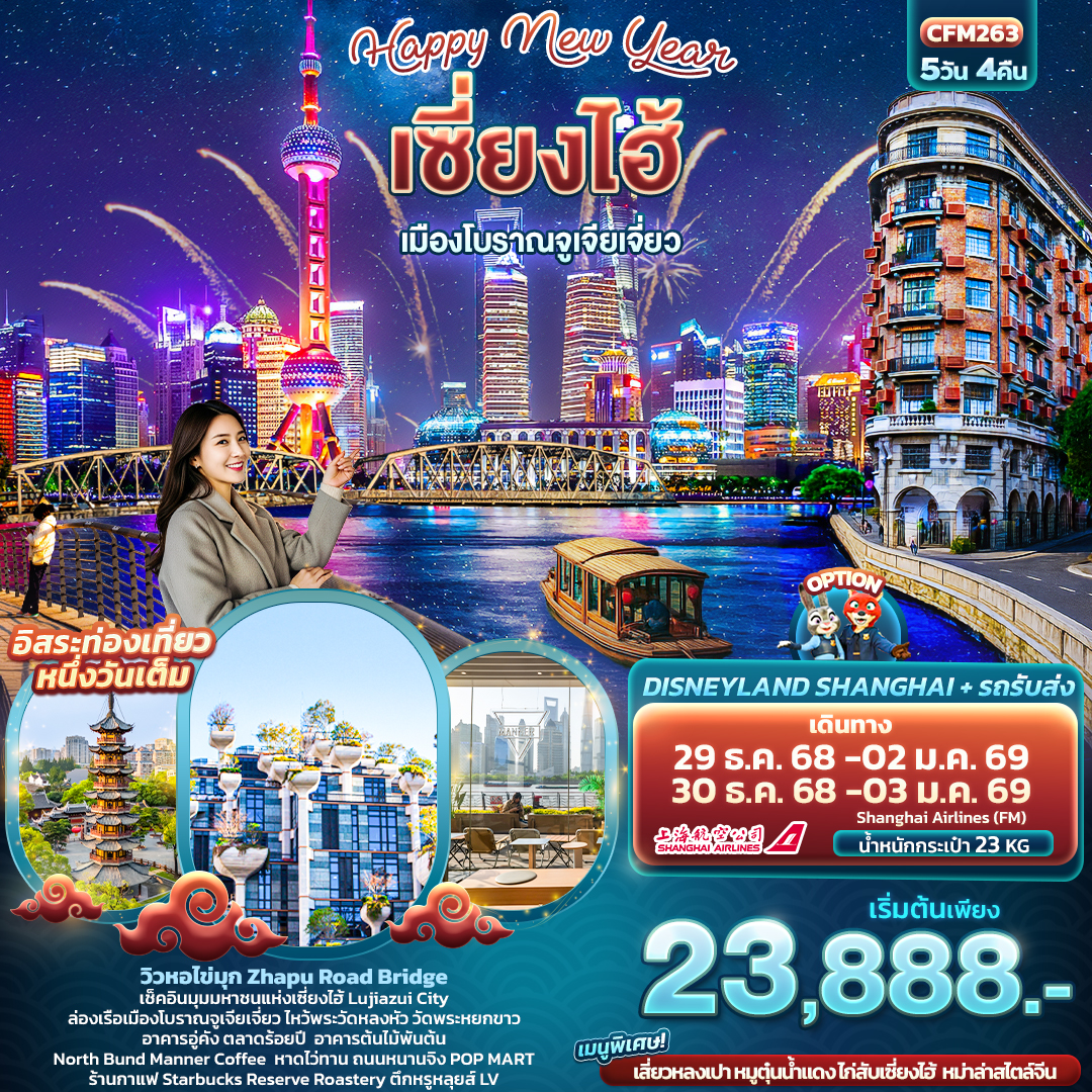 ทัวร์เซี่ยงไฮ้ ปีใหม่ 2569 ล่องเรือเมืองโบราณจูเจียเจี่ยว วัดพระหยกขาว หอไข่มุก 5 วัน 4 คืน (อิสระท่องเที่ยวหนึ่งวันเต็ม)