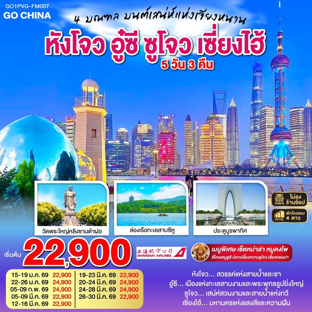 ทัวร์เซี่ยงไฮ้ 2569 อู่ซี อูเจิ้น หางโจว เช็คอิน 3 เมืองดัง ไหว้พระใหญ่หลิงซาน เสริมมงคลชีวิต ล่องเรือชมความงานทะเลสาบซีหู เดินชมความงามหาดเจ้าพ่อเซี่ยงไฮ้ หอไข่มุก 5 วัน 3 คืน (ทัวร์ลงร้านช้อป) พักโรงแรม 4 ดาว