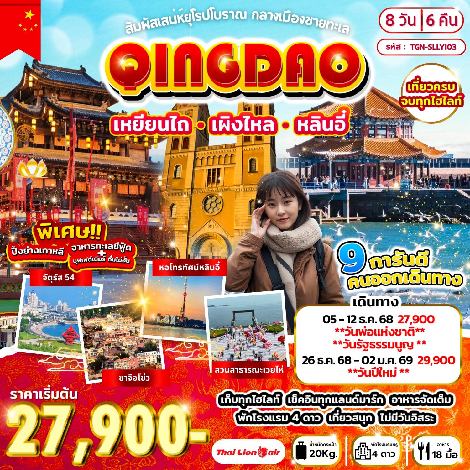 กรุงเทพฯ (ดอนเมือง) -สนามบินดอนเมือง - สนามบินหลินหยี - บ้านเกิดนักกวีหวางขี่จื่อ -ตลาดค้าส่งหลินยี่ - ถนนชินหลางหยา - ล่องเรือแน่น้ำหลินเหอ -หลินหยี - ชิงเต่า - กระเช้าภูเขาไท่ผิง - โบสถ์ St. Michael′s - ย่าน Da Bao ชมเมืองเก่าสไตล์เยอรมัน-จีน - สะพานจ้านเฉี่ยว -ถนนคนเดินจงซาน ภูเขาเหลาซาน (รวมรถอุทยาน) - พระราชวังไก่ชิง - หมู่บ้าน ประมงชาจือโข่ว - โรงงานเบียร์ชิงเต่า (ซิมเบียร์) - จัดรัส 54 -ถนนปาต้ากวน - ถนนพี่จายย่วน - No.3 Bathing Beach -พิพิรภัณห์ข็งเต่า - ขมวิวซิกแนล ฮิลล์ (รวมค่าเข้า)