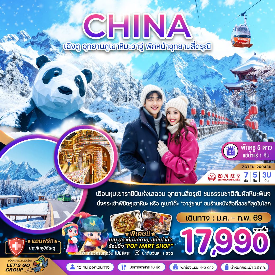 ทัวร์เฉิงตู ปีใหม่ 2569 เหมยซาน ภูเขาหิมะวาวู่ ถนนโบราณจิ๋นหลี่ แพนด้ายักษ์ปีนตึก IFS 3 วัน 2 คืน (พักโรงแรมระดับ 4 ดาว)