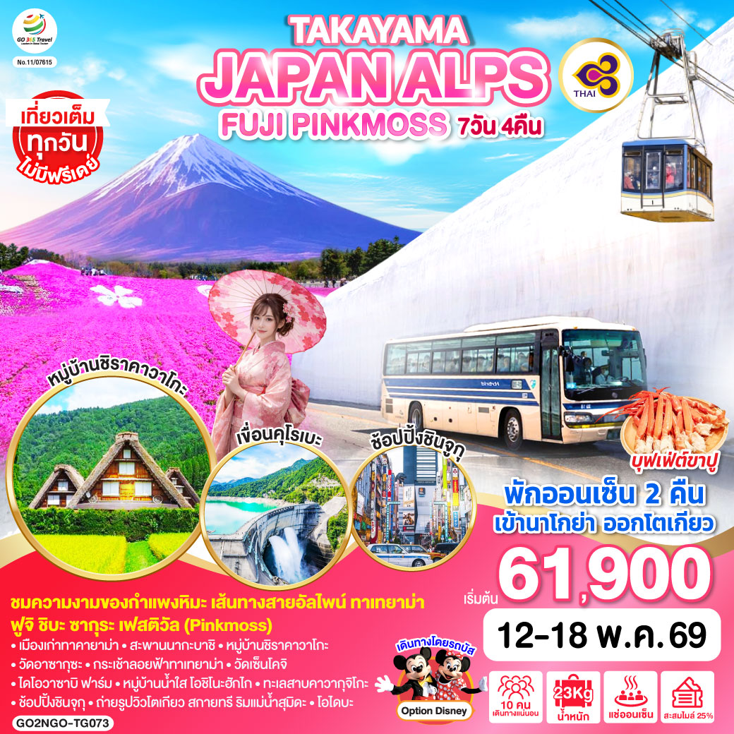 ทัวร์ญี่ปุ่น นาโกย่า 2569 TAKAYAMA ฟูจิ ชิบะ ซากุระ เฟสติวัล Pinkmoss หมู่บ้านน้ำใส โอชิโนะฮักไก 7 วัน 4 คืน (พักออนเซ็น 2 คืน) เที่ยวเต็มทุกวัน ไม่มีฟรีเดย์ สายการบินไทย [TG]