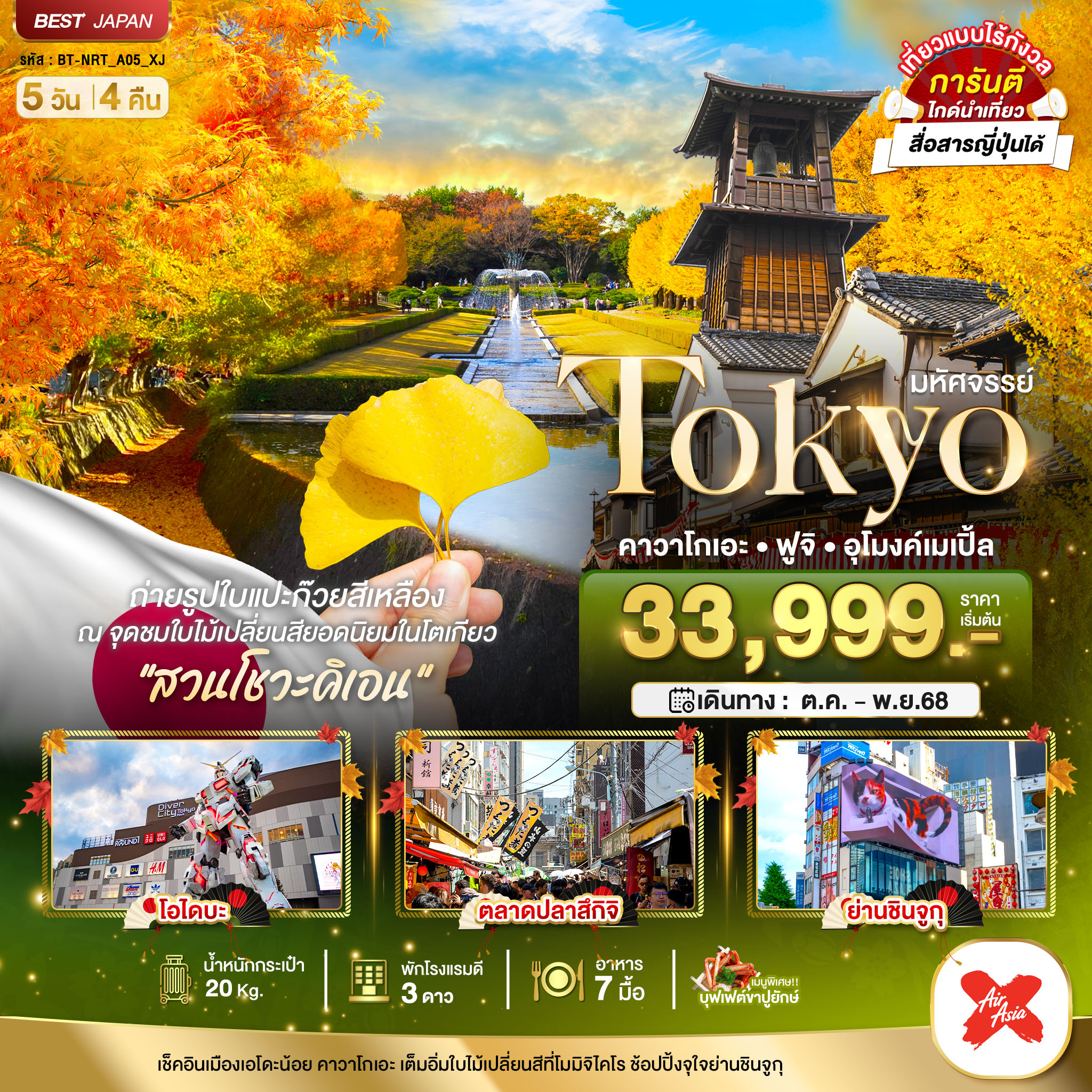 ทัวร์โตเกียว คาวาโกเอะ ฟูจิ อุโมงค์เมเปิ้ล ใบแปะก๊วยสีเหลือง ใบไม้เปลี่ยนสี สวนโชวะคิเอน 5 วัน 4 คืน (บุฟเฟต์ขาปู)