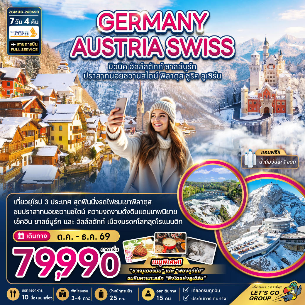 ทัวร์ยุโรป ปีใหม่ 2570 เยอรมัน ออสเตรีย สวิตเซอร์แลนด์ ชมปราสาทนอยชวานสไตน์ เขาพิลาตุส 7 วัน 4 คืน สายการบิน FULL SERVICE (พักโรงแรม 4 ดาว)
