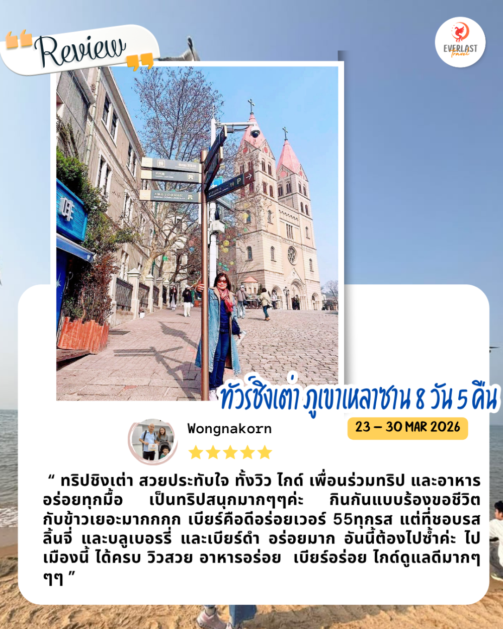 “ ทริปชิงเต่า สวยประทับใจ ทั้งวิว ไกด์ เพื่อนร่วมทริป และอาหารอร่อยทุกมื้อ เป็นทริปสนุกมากๆๆค่ะ กินกันแบบร้องขอชีวิต กับข้าวเยอะมากกกก เบียร์คือดีอร่อยเวอร์ 55ทุกรส แต่ที่ชอบรสลิ้นจี่ และบลูเบอรรี่ และเบียร์ดำ อร่อยมาก อันนี้ต้องไปซ้ำค่ะ ไปเมืองนี้ ได้ครบ วิวสวย อาหารอร่อย เบียร์อร่อย ไกด์ดูแลดีมากๆๆๆ ”