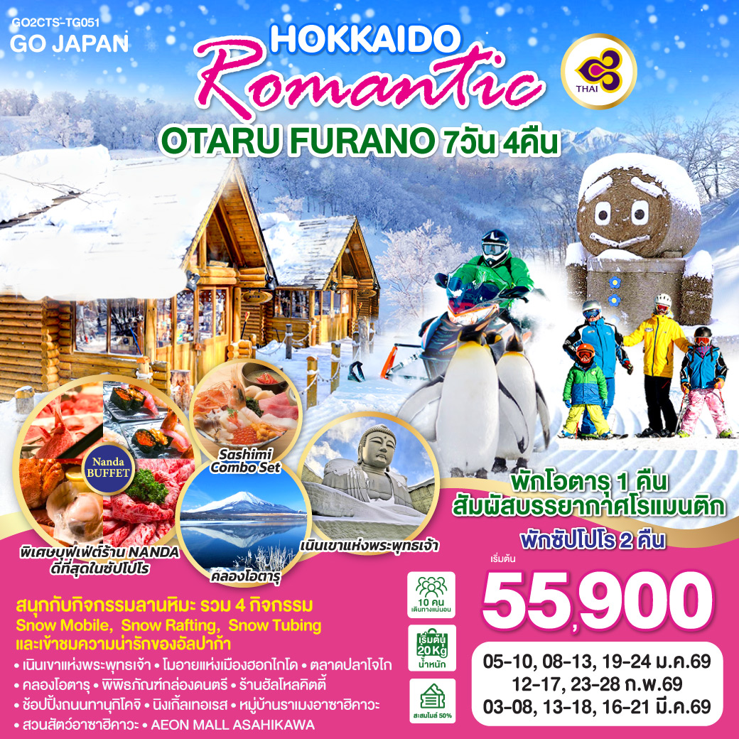 ทัวร์ฮอกไกโด 2569 ซัปโปโร ฮาโกดาเตะ คลองโอตารุ ลานสกีคิโรโระ พระใหญ่อะตามะ ไดบุตสึ 7 วัน 4 คืน (เที่ยวอิสระ 1 วัน) สายการบิน FULL SERVICE พักโอตารุ 1 คืน
