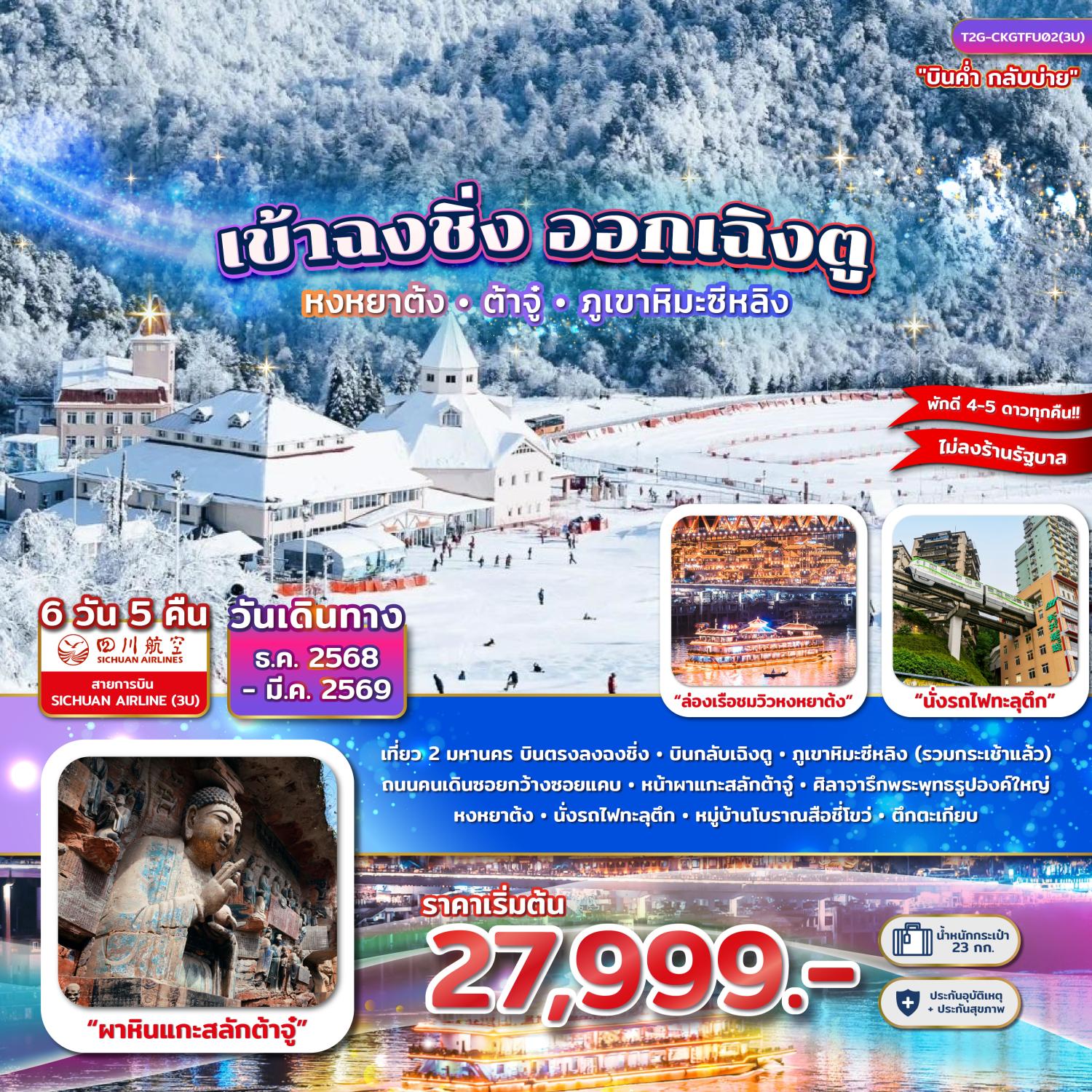 ทัวร์เฉิงตู 2569 เขาสี่ดรุณี ภูเขาหิมะว่าหวู่ซาน ล่องเรือเล่อซาน ชมโชว์น้ำตาสีฟ้า สุดอลังการ 6 วัน 5 คืน (ทัวร์ไม่ลงร้านช้อป)