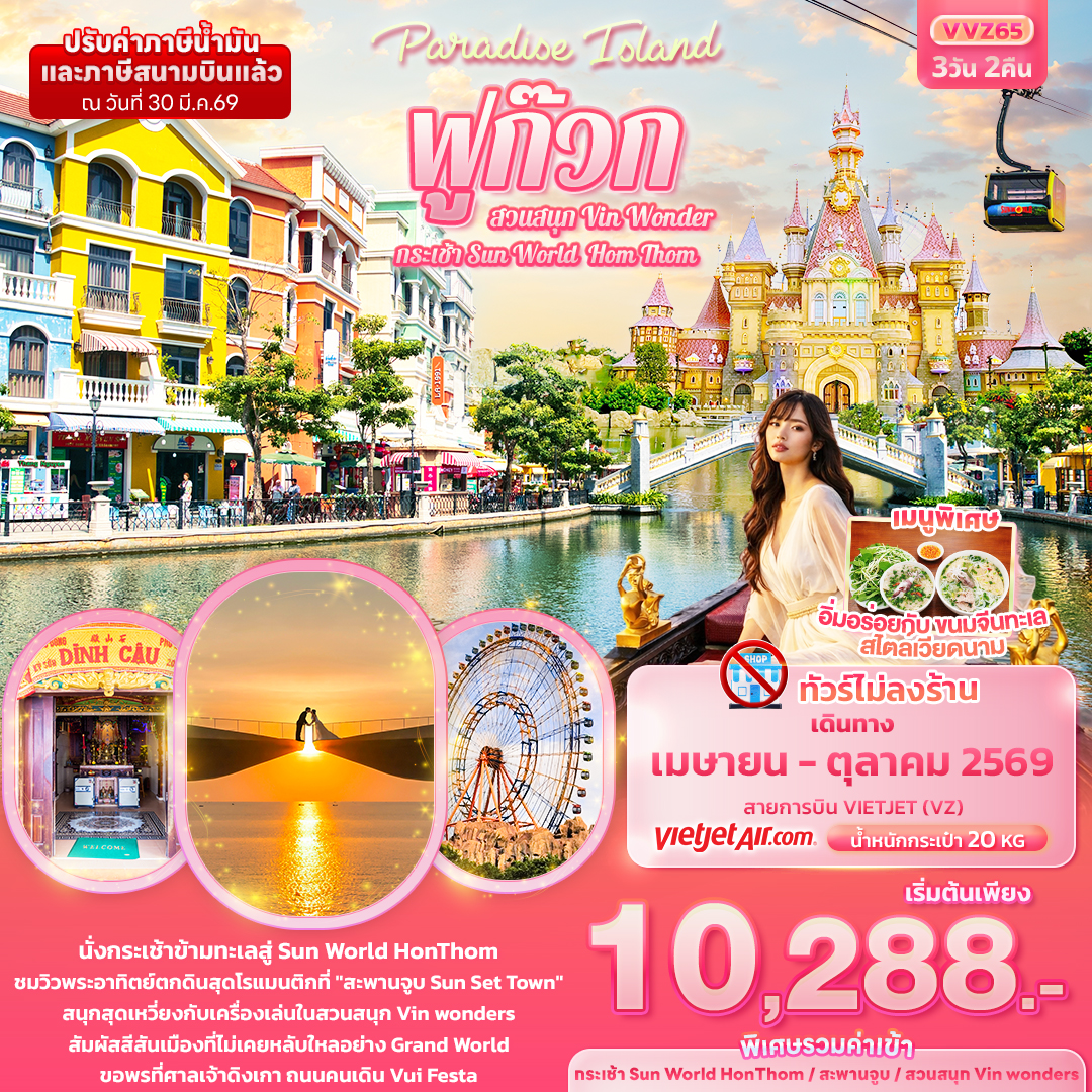 ไฮไลท์ ท่าอากาศยานนานาชาติสุวรรณภูมิ – ท่าอากาศยานนานาชาติฟูก๊วก ประเทศเวียดนาม – ฟูก๊วก – นั่งกระเช้าสู่ Sun World Hon Thom +Aquatopia Water Park + Exotica Village - ชายหาด Hon Thom - Sun Set Town – สะพานจูบ - ถนนคนเดิน VUI-Fest Bazaar • เที่ยวสวนสนุก Vin wonders - Grand World Food Street เมืองที่ไม่เคยหลับใหล • ศาลเจ้าดิงเกา - ท่าอากาศยานนานาชาติฟูก๊วก ประเทศเวียดนาม - ท่าอากาศยานนานาชาติสุวรรณภูมิ