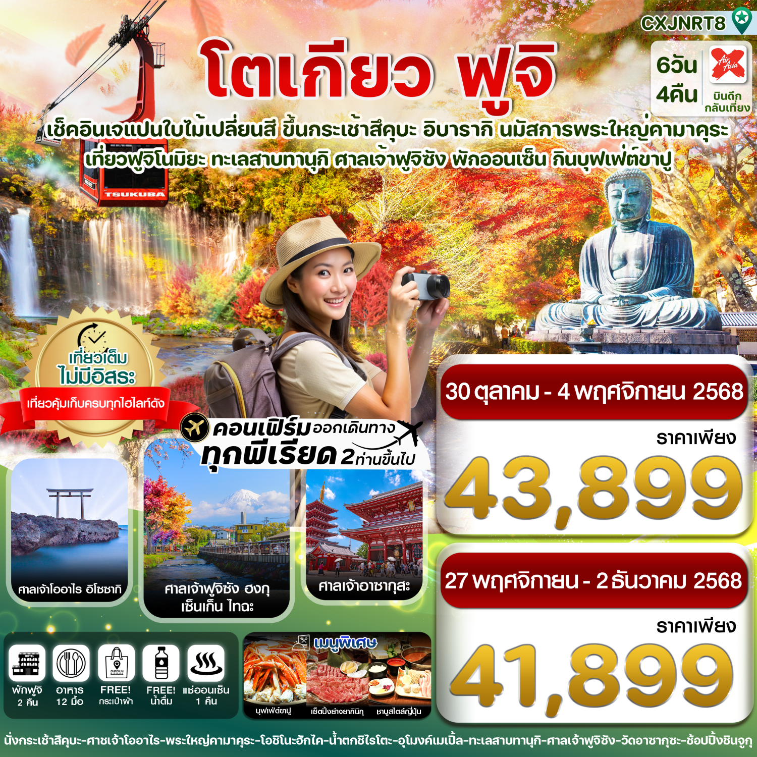 ทัวร์โตเกียว ฟูจิ เช็คอินใบไม้เปลี่ยนสี ขึ้นกระเช้าสึคุบะ นมัสการพระใหญ่คามาคุระ เที่ยวฟูจิโนมิยะ 6 วัน 4 คืน พักฟูจิ 2 คืน (พักออนเซ็น 1 คืน)