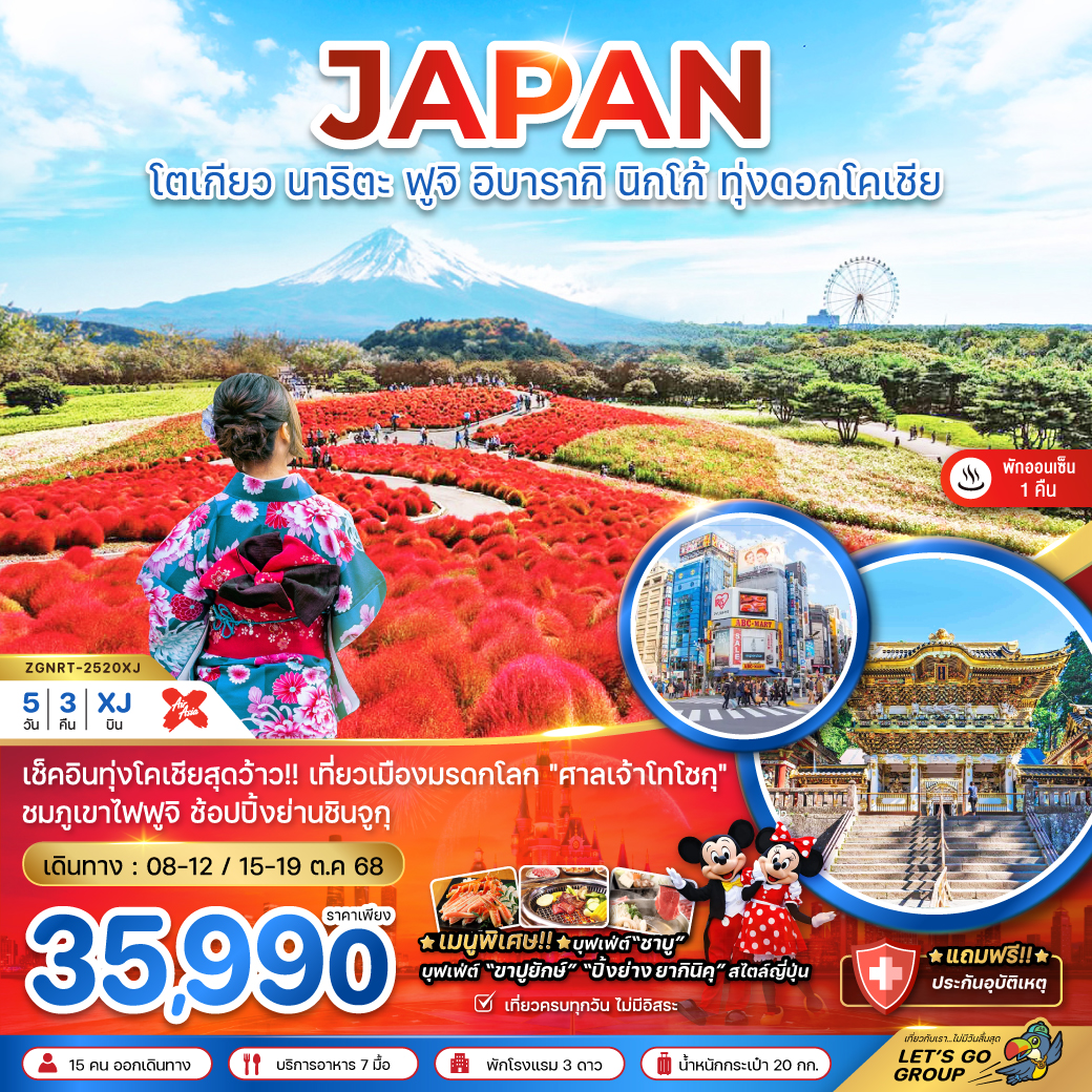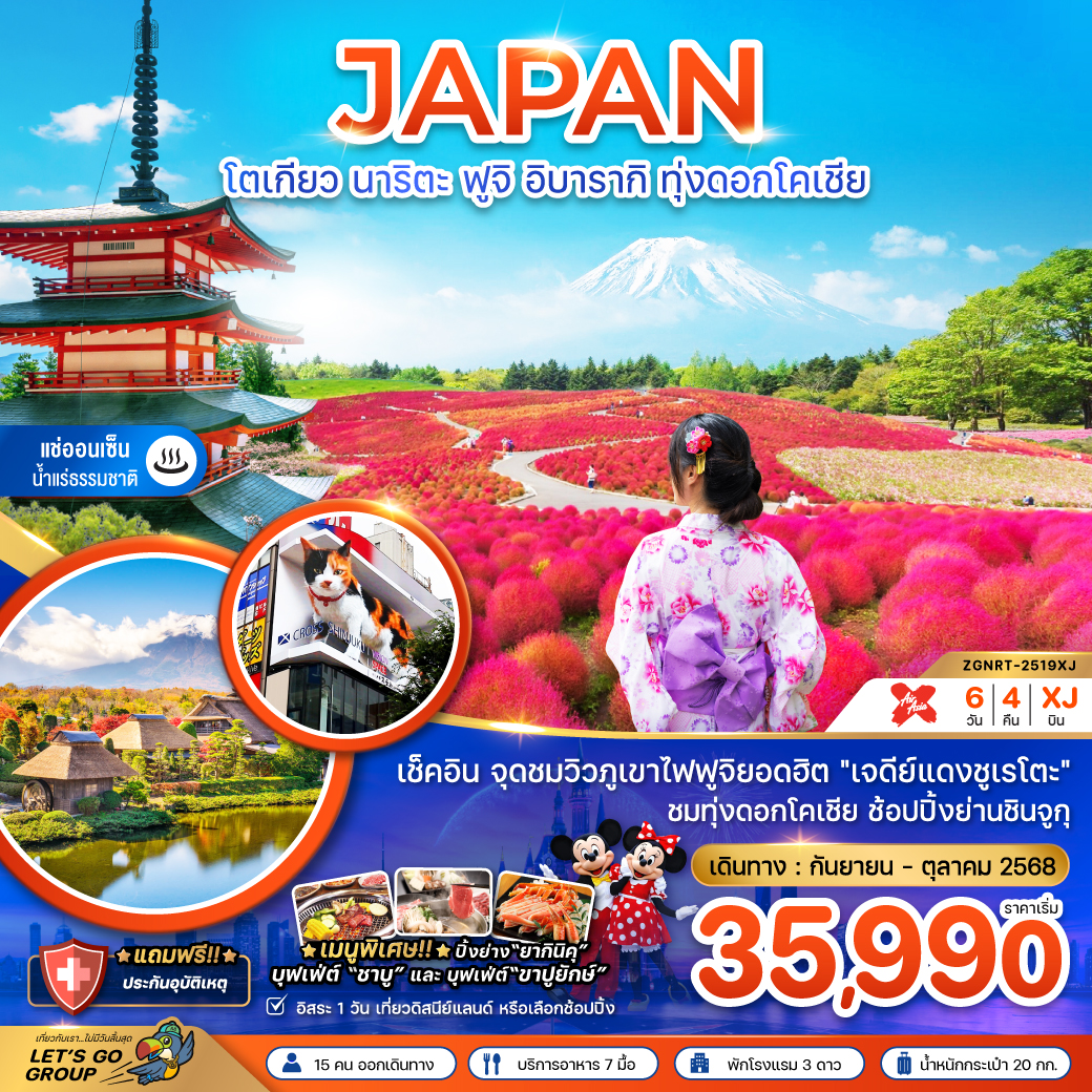 ทัวร์ญี่ปุ่น โตเกียว นาริตะ ภูเขาไฟฟูจิ อิบารากิ ทุ่งดอกโคเชีย แช่น้ำแร่ธรรมชาติ ช้อปปิ้งย่านชินชูกุ 6 วัน 4 คืน (อิสระฟรีเดย์ 1 วัน)