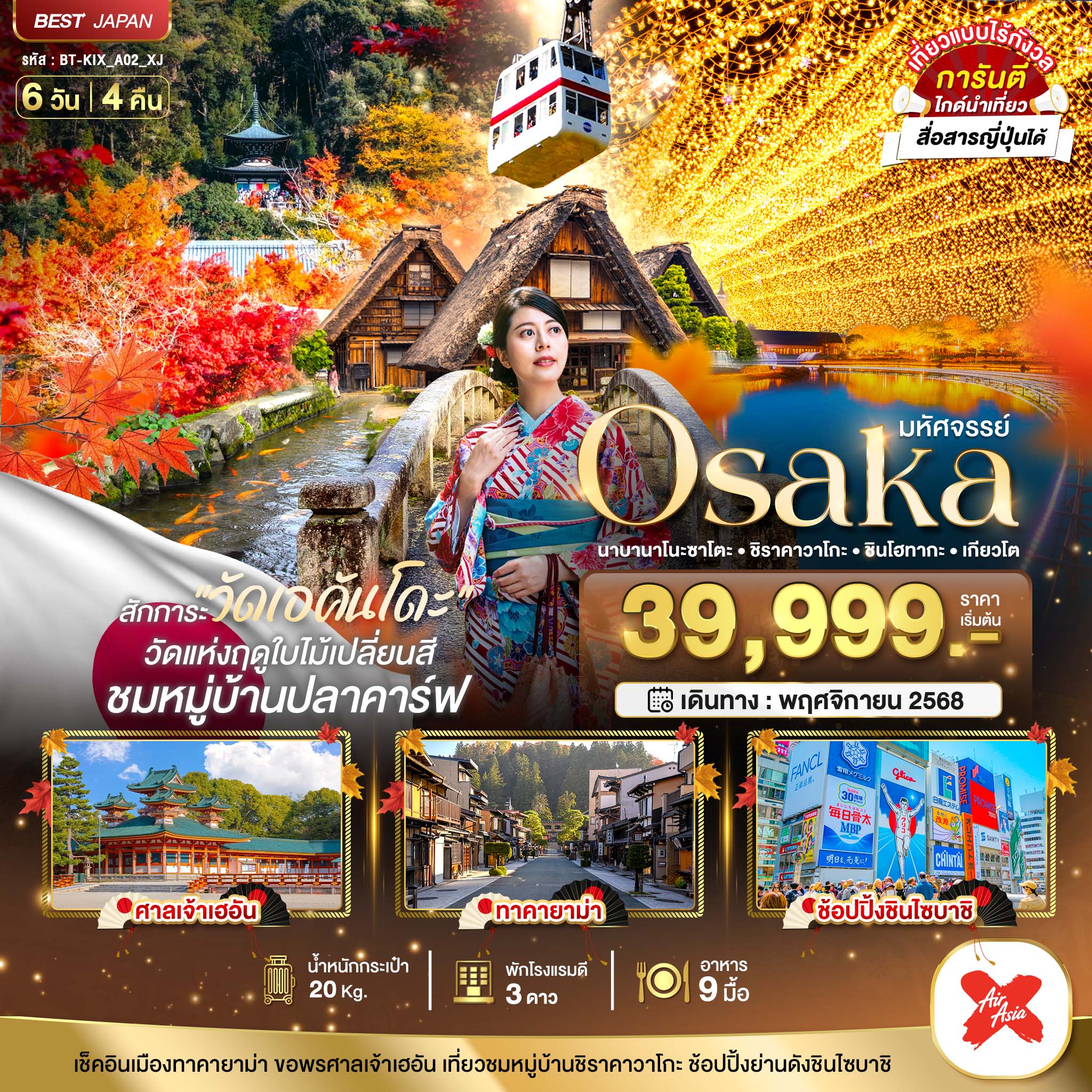 กรุงเทพฯ สนามบินดอนเมือง - ท่าอากาศยานคันไซ ประเทศญี่ปุ่น • วัดเอคันโดะ • เทศกาลไฟนาบานาโนะซาโตะ - วัดโอสุคันนง • หมู่บ้านชิราคาวาโกะ • เมืองทาคายาม่า • สะพานนาคะบาชิ • ถนนเมืองเก่าซันมาจิ - กระเช้าชินโฮทากะ • เมืองฮิดะ ฟุรุคาวะ • ชมเมืองปลาคาร์ฟ • อิออน - เกียวโต • ศาลเจ้เฮอัน • ช้อปปิ้งปลอดภาษี • ชินไซบาชิ - สนามบินคันไซ ประเทศญี่ปุ่น • สนามบินดอนเมือง กรุงเทพ